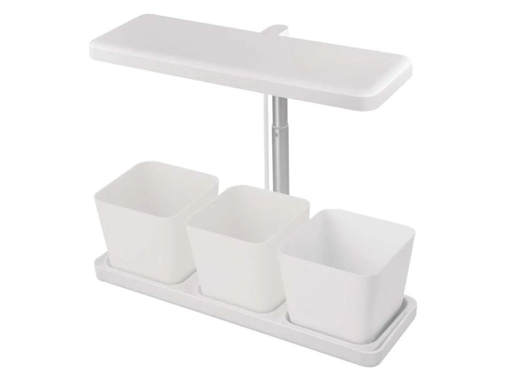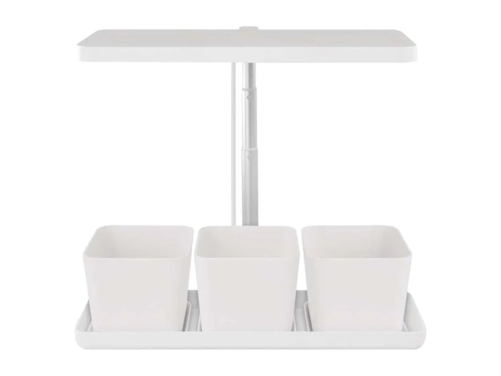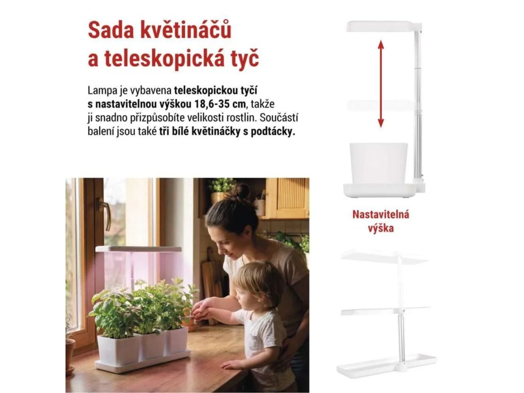Součástí svítidla je teleskopická tyč s nastavitelnou výškou v rozsahu 18,6–35 cm, která umožňuje snadné přizpůsobení podle výšky rostlin a fáze jejich růstu. Konstrukce lampy je navržena pro stabilní umístění přímo nad květináči, přičemž součástí balení jsou také tři bílé květináče s podtácky, ideální pro pěstování více druhů bylinek současně.