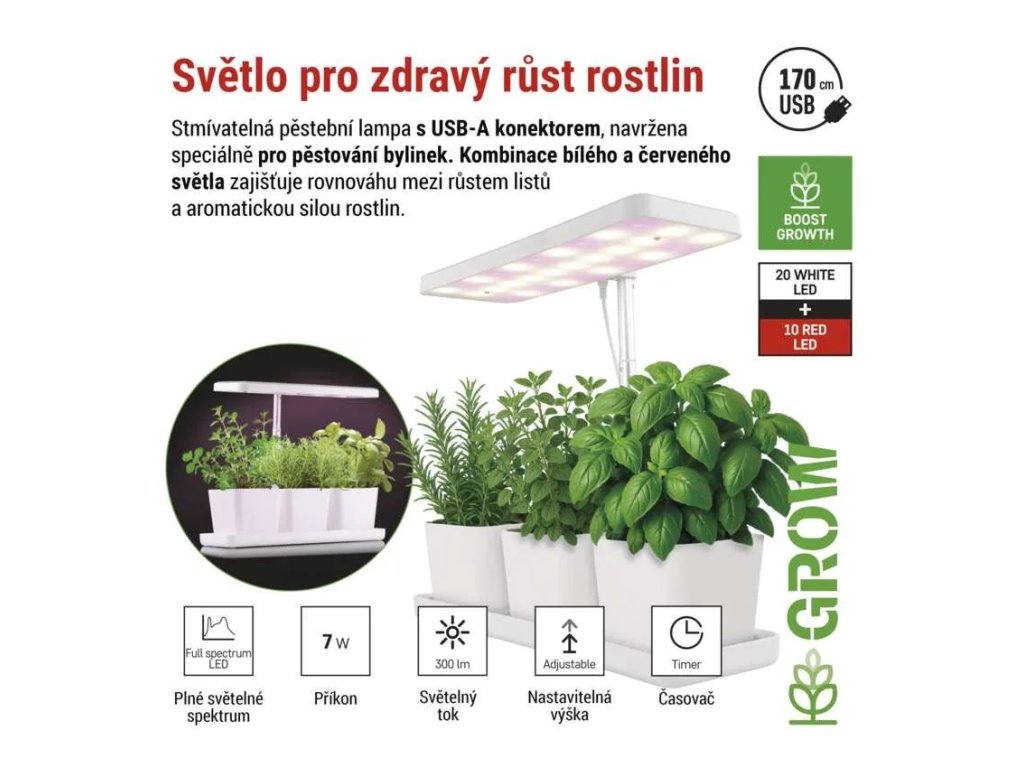 Při výkonu 7 W nabízí lampa dostatečný světelný výkon při zachování úsporného provozu. Světelný tok 300 lm je optimalizovaný pro pěstování bylinek na kuchyňské lince, parapetu nebo pracovní desce, kde je důležité rovnoměrné a cílené osvětlení rostlin po celý den.