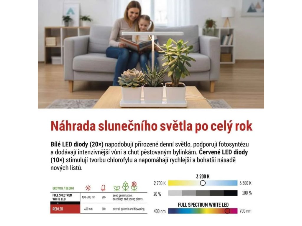 Svítidlo využívá plnospektrální LED technologii v rozsahu 400–700 nm, která věrně napodobuje sluneční světlo. Kombinace bílých a červených LED podporuje fotosyntézu, přirozený růst listů i stonků, tvorbu silného kořenového systému a zároveň přispívá k intenzivnímu aroma a chuti pěstovaných bylinek. Bílé LED zajišťují přirozené denní světlo a správný tvar listů, zatímco červené spektrum podporuje regeneraci, hustotu porostu a vitalitu rostlin.