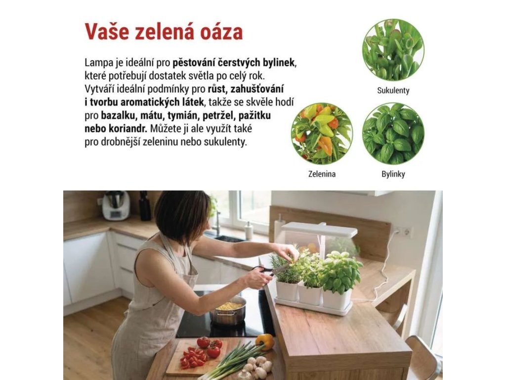 LED pěstební lampa je kompaktní a elegantní řešení pro podporu růstu bylinek, menší zeleniny, sukulentů i pokojových rostlin v interiéru. Poskytuje rostlinám potřebné světlo všude tam, kde chybí přirozené denní osvětlení, a pomáhá udržet jejich zdravý vzhled, pevné listy a syté barvy po celý rok, a to i během zimních měsíců nebo v tmavších místnostech.