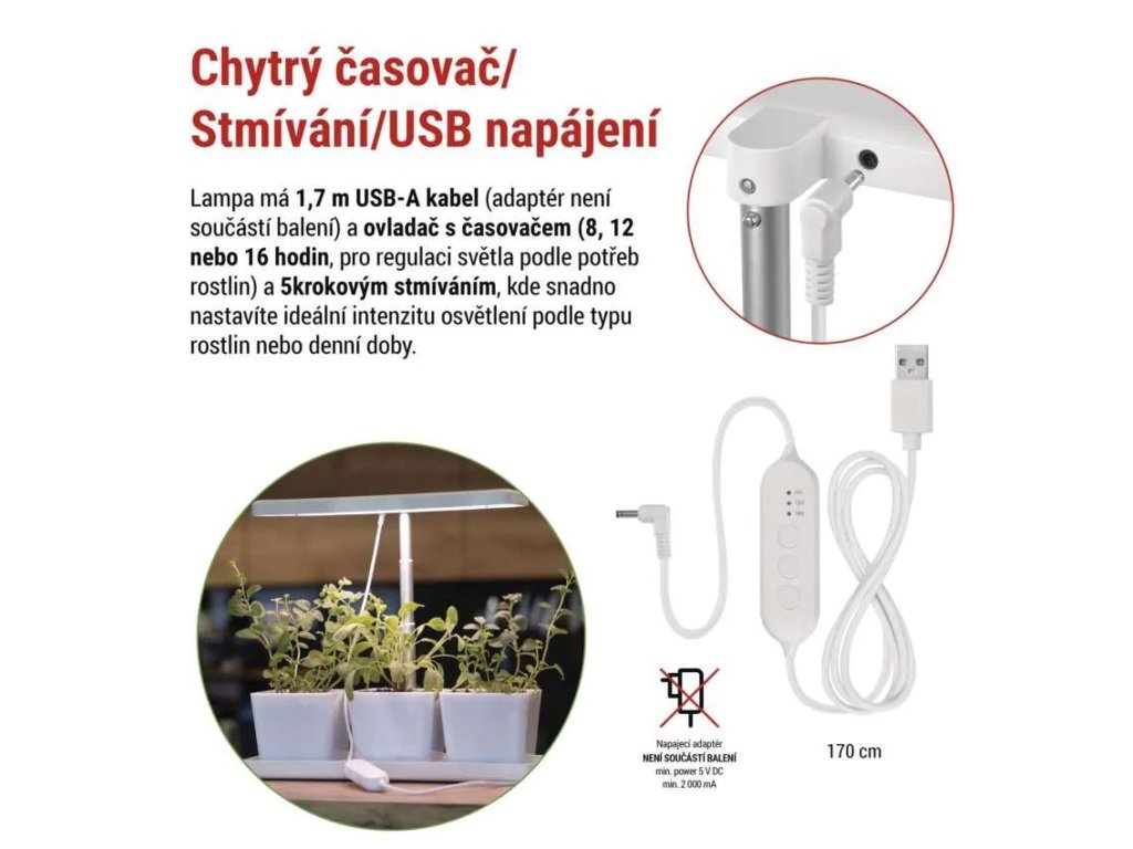 Lampa je napájena pomocí USB-A kabelu o délce 1,7 m, což umožňuje připojení k USB adaptéru, powerbance nebo počítači. Ovládání je umístěno přímo na kabelu a nabízí vestavěný časovač s režimy 8, 12 nebo 16 hodin a pětikrokové stmívání, díky kterému lze snadno nastavit intenzitu osvětlení podle typu rostlin nebo denní doby. Svítidlo tak podporuje přirozený denní rytmus bez nutnosti každodenního manuálního ovládání.