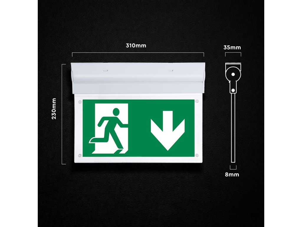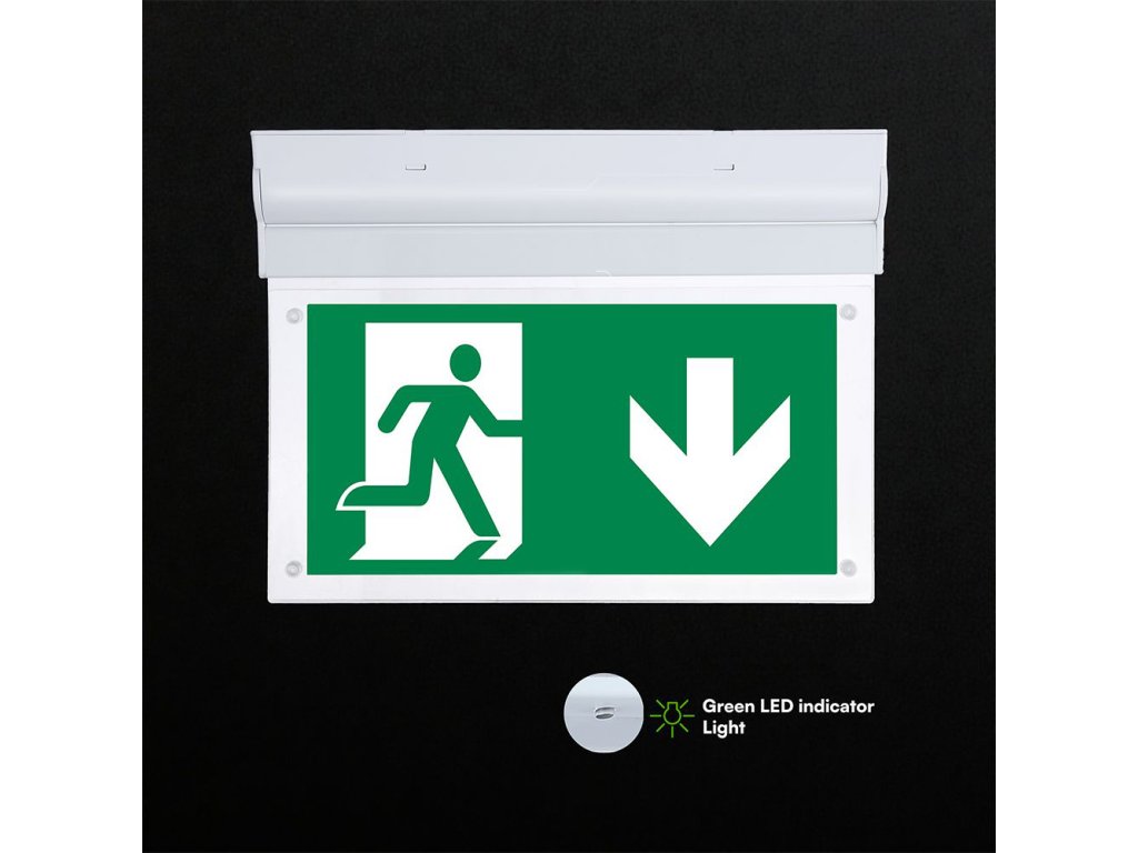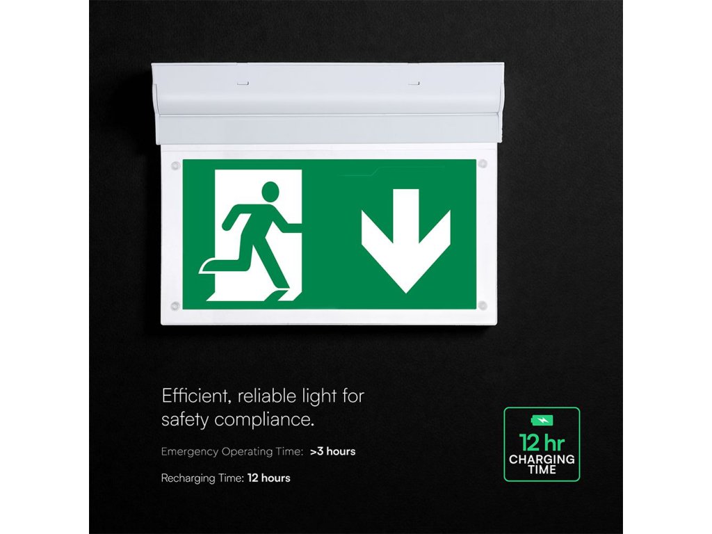 Součástí balení jsou čtyři různé piktogramy, které umožňují přizpůsobit značení konkrétnímu směru úniku dle potřeb daného prostoru. Svítidlo je vhodné pro montáž na stěnu i strop a díky nastavitelnému úhlu zavěšení umožňuje přesné nasměrování tabulky. Díky své spolehlivosti, nízké spotřebě a souladu s požadavky na bezpečnostní osvětlení je ideální volbou pro komerční objekty, veřejné budovy, kanceláře i průmyslové prostory a je dodáváno se zárukou 3 roky.