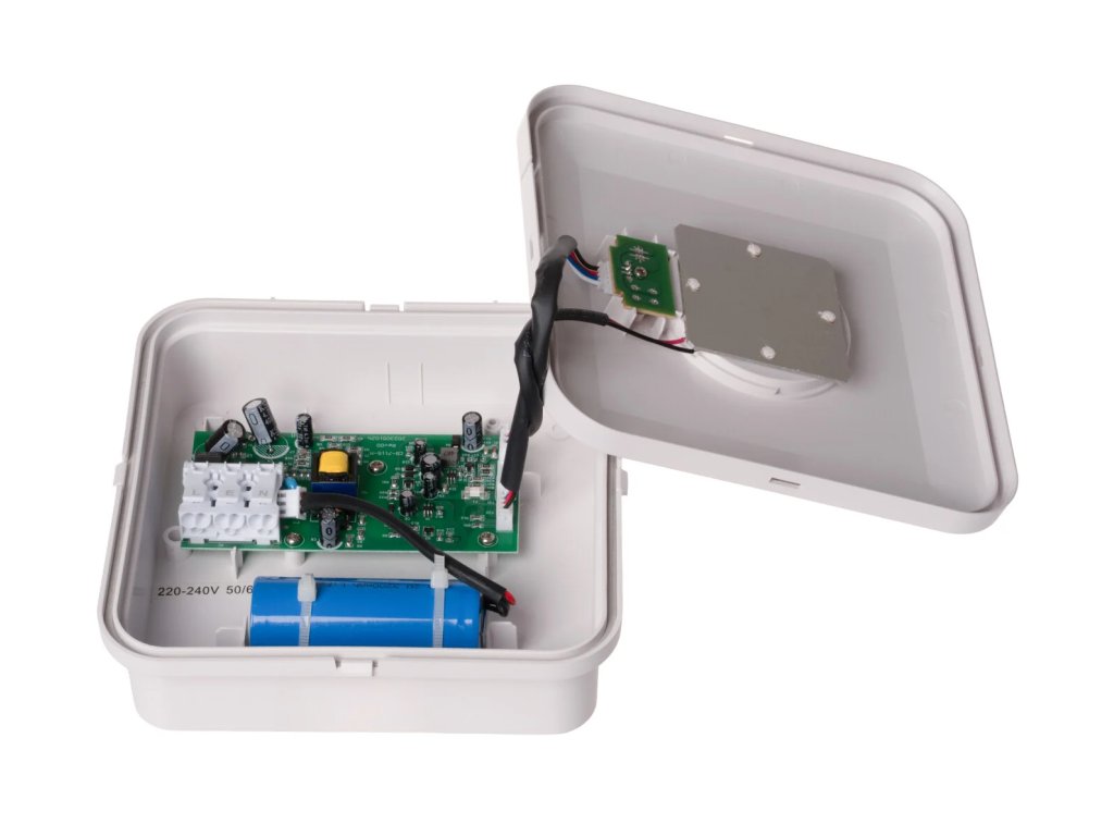 Protipanické stropní LED nouzové svítidlo v bílém provedení s vestavěným akumulátorem o kapacitě 2300 mAh je určeno pro spolehlivé nouzové osvětlení při výpadku elektrické energie. V případě přerušení napájení poskytuje až 3 hodiny nepřetržitého svícení, přičemž doba plného nabití baterie činí přibližně 24 hodin. Během běžného provozu se svítidlo automaticky dobíjí a aktivuje se pouze při výpadku proudu.