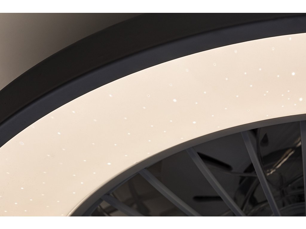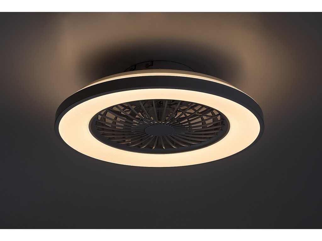 Součástí svítidla je zabudovaný ventilátor s výkonem 15 W, jehož rychlost lze nastavit podle aktuální potřeby. Ventilátor zajišťuje efektivní cirkulaci vzduchu a je vhodný pro místnosti o velikosti až 33 m². Provoz je tichý, s hlučností v rozmezí přibližně 30 až 50 dB v závislosti na zvolené rychlosti, což umožňuje jeho použití i v ložnicích nebo pracovních prostorách.