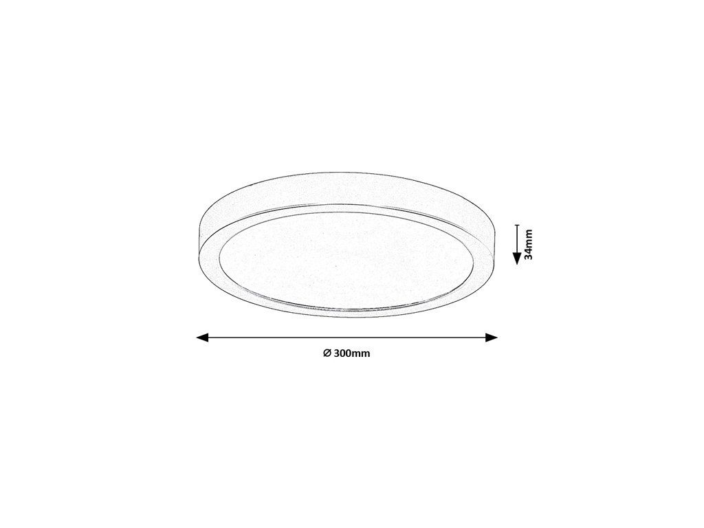 Rozměry svítidla jsou 300 mm v průměru a 34 mm na výšku.