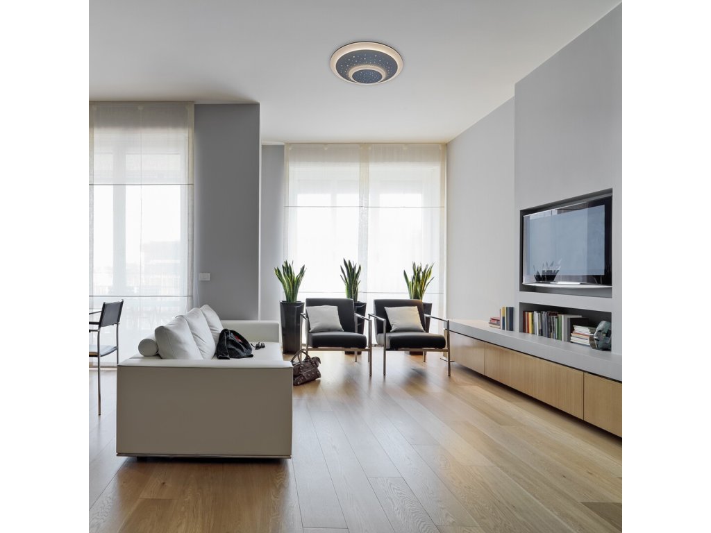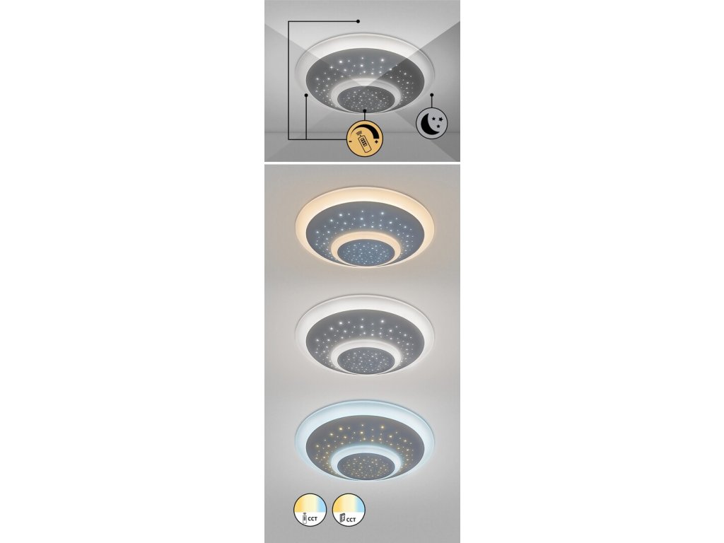 Svítidlo je vybaveno integrovaným LED světelným zdrojem s výkonem 47 W a nabízí světelný tok 2 440 lumenů. Díky nastavitelné barevné teplotě v rozmezí 3000 až 6000 K můžete snadno přepínat mezi teplým, neutrálním a studeným bílým světlem podle potřeby. K dispozici je také stmívání a funkce nočního svícení, které oceníte zejména ve večerních hodinách.