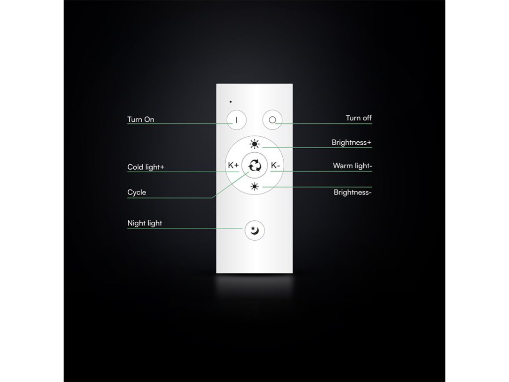 Díky technologii CCT si snadno nastavíte barvu světla přesně podle aktuální potřeby – od teplé bílé pro večerní relaxaci až po neutrální denní bílou vhodnou pro soustředění. Rozsah 3000–5000 K poskytuje velkou flexibilitu, kterou běžná jednobarevná svítidla nenabízí. Veškeré funkce ovládáte pohodlně pomocí přiloženého dálkového ovladače: změnu teploty chromatičnosti, stmívání, noční režim i zapnutí či vypnutí.