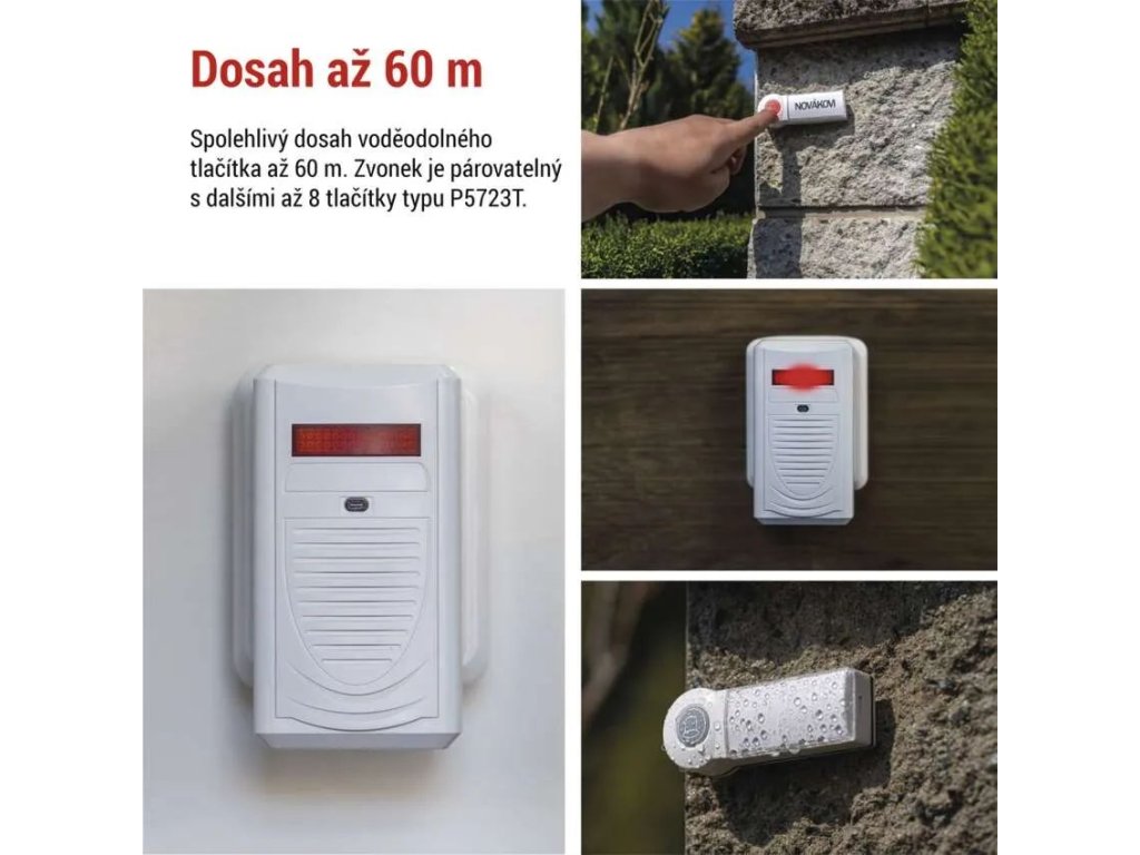 Díky dosahu až 60 metrů (v otevřeném prostoru) poskytuje tento model dostatek flexibility pro běžné domácí použití. Zároveň je možné zvonek rozšířit a spárovat až s 8 tlačítky typu P5723T, což z něj dělá ideální volbu i pro větší domy nebo vícevchodové objekty.