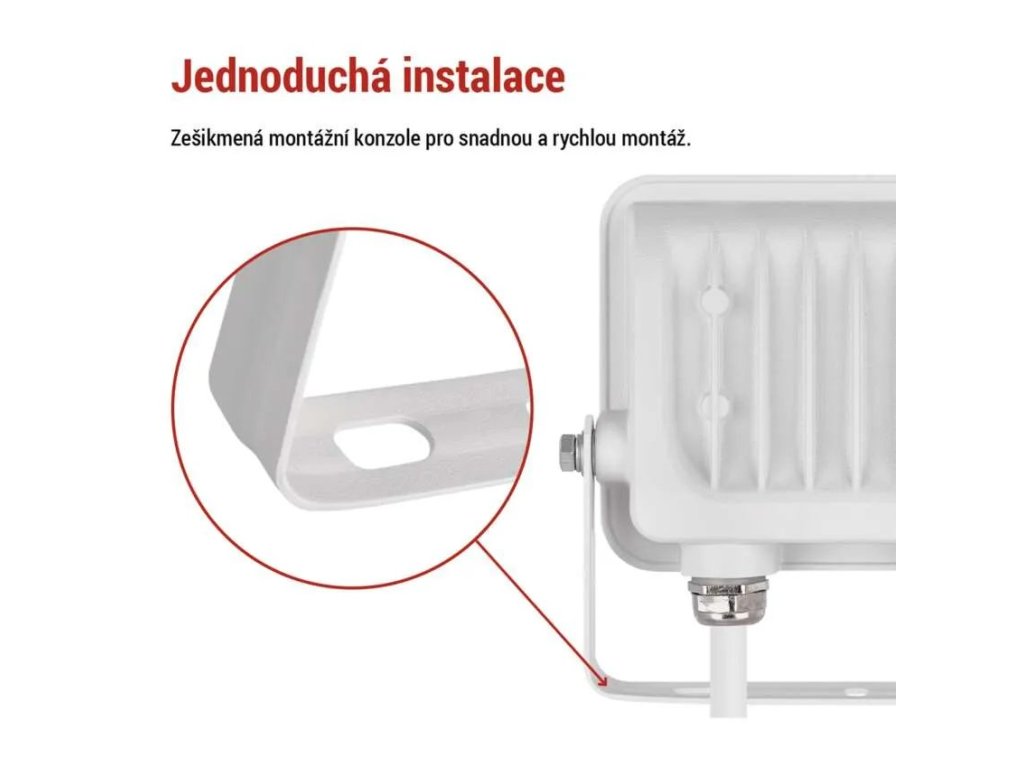 Součástí konstrukce je praktická zešikmená montážní konzole, díky níž lze snadno nastavit přesný směr svícení a upevnit reflektor na fasádu, stěnu nebo jiný povrch bez složitých úprav. K rychlému zapojení slouží přívodní kabel s gumovým pláštěm o délce 25 cm, který zajišťuje bezpečné a spolehlivé připojení. Reflektor se po zapnutí okamžitě rozsvítí na plný výkon, pracuje bez blikání a díky moderní LED technologii výrazně snižuje provozní náklady.