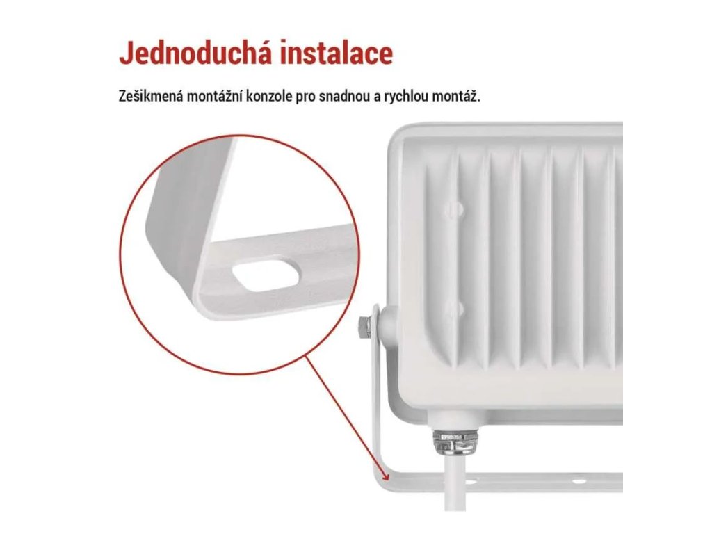 Součástí konstrukce je praktická zešikmená montážní konzole, díky níž lze snadno nastavit přesný směr svícení a upevnit reflektor na fasádu, stěnu nebo jiný povrch bez složitých úprav. K rychlému zapojení slouží přívodní kabel s gumovým pláštěm o délce 25 cm, který zajišťuje bezpečné a spolehlivé připojení. Reflektor se po zapnutí okamžitě rozsvítí na plný výkon, pracuje bez blikání a díky moderní LED technologii výrazně snižuje provozní náklady.