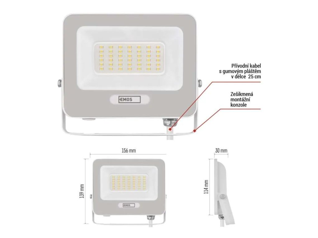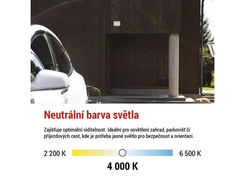 LED reflektor s výkonem 30 W přináší vysokou světelnou účinnost 100 lm/W a poskytuje tak silné a zároveň úsporné osvětlení pro venkovní i vnitřní použití. Světelný tok 3 000 lm spolehlivě nasvítí fasády domů, příjezdové cesty, zahrady, garáže i menší firemní prostory. Neutrální bílá barva světla s teplotou 4 000 K zajišťuje přirozenou viditelnost a rovnoměrné osvětlení bez nepříjemných barevných tónů, takže je vhodná pro orientaci, bezpečný pohyb i práci.