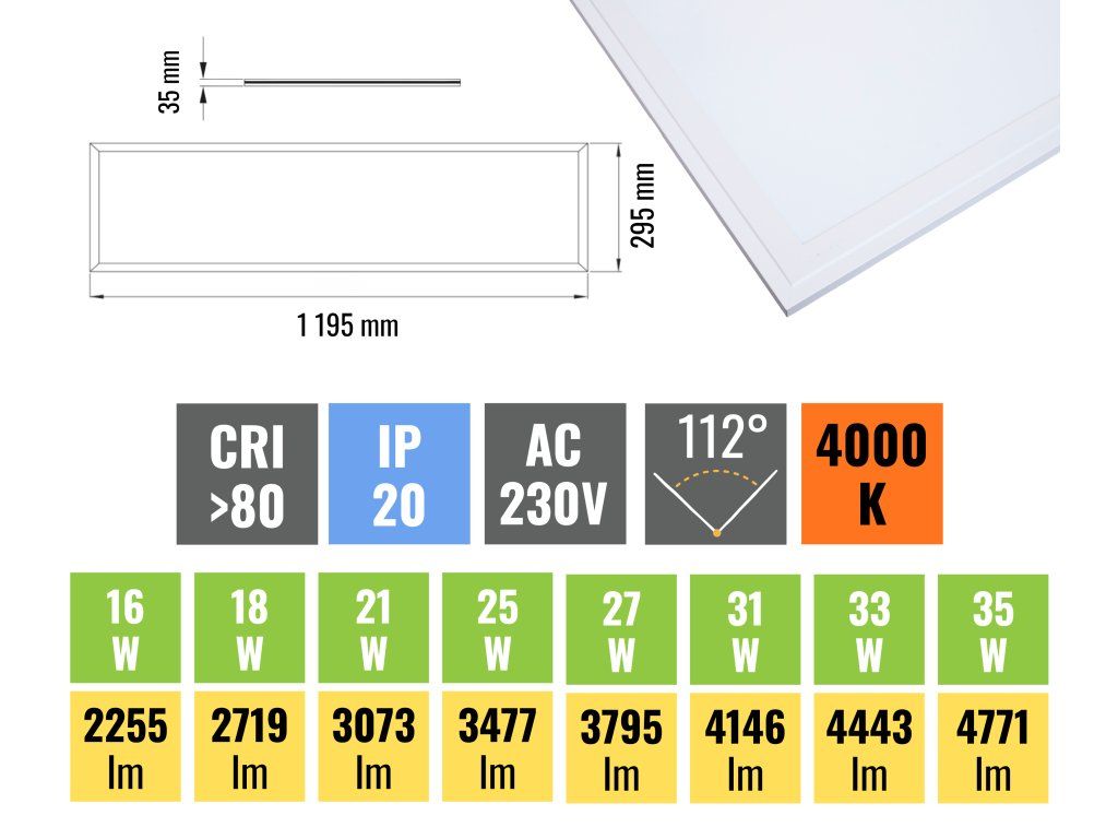 Prémiový LED panel s nastavitelným výkonem 16-35W a efektivitou 130lm/W za skvělou cenu. Tento panel o výkonu 16-35W a rozměru 30 x 120cm se skvěle hodí do podhledových aplikací. Snadno se vkládá do kazetových stropů ale lze jej objednat také s příslušenstvím pro montáž do sádrokartonu nebo pro přisazení ke zděnému stropu či zavěšení.