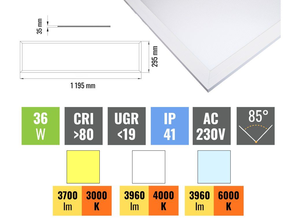 LED panel s prizmatickým difuzorem snižující oslnění za skvělou cenu. Díky parametru UGR <19 (neoslňuje) se hodí především do kanceláří a jiných pracovišť, kde je kladen důraz na světlenou pohodu. Tento panel o výkonu 36W a rozměru 30 x 120cm se skvěle hodí do podhledových aplikací. Nejčastěji je používán do kazetových stropů, kde stačí pouze zapojit panel k síti. Není potřeba žádné další příslušenství pro montáž panelů.