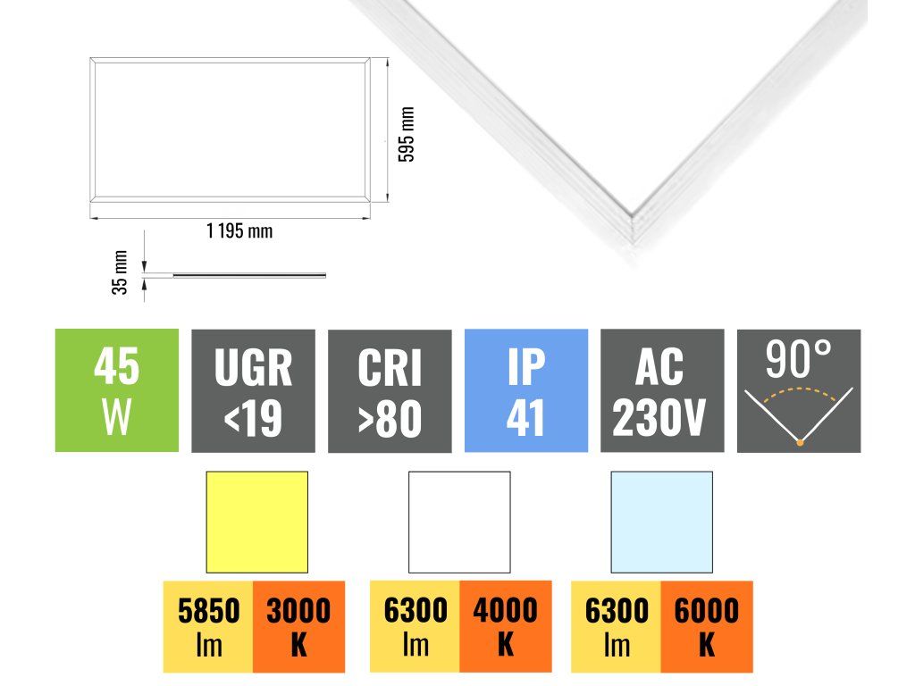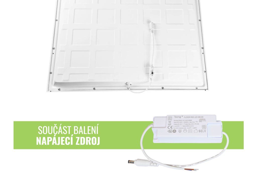 Panel je vybaven hliníkovým rámem pro efektivní odvod tepla, okamžitým startem bez blikání a životností až 50 000 hodin. Krytí IP41 jej chrání proti prachu a vlhkosti z běžného provozu, takže je vhodný pro instalaci do vnitřních prostor.
