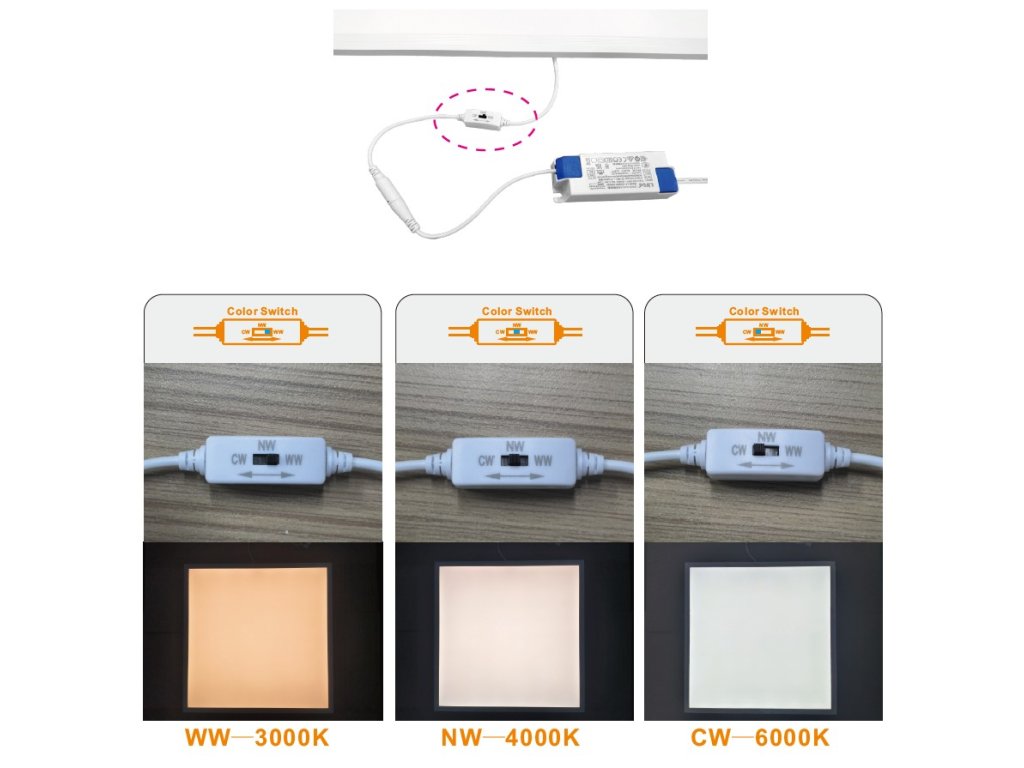 Podhledový LED panel s výkonem 45 W a vysokou účinností až 140 lm/W nabízí moderní a úsporné osvětlení s možností nastavení barvy světla. Pomocí integrovaného přepínače (CCT switch) si můžete jednoduše zvolit teplou bílou 3000 K, neutrální bílou 4000 K nebo studenou bílou 6000 K. Díky tomu se panel přizpůsobí konkrétním potřebám prostoru a zajistí vždy ideální světelnou atmosféru.
