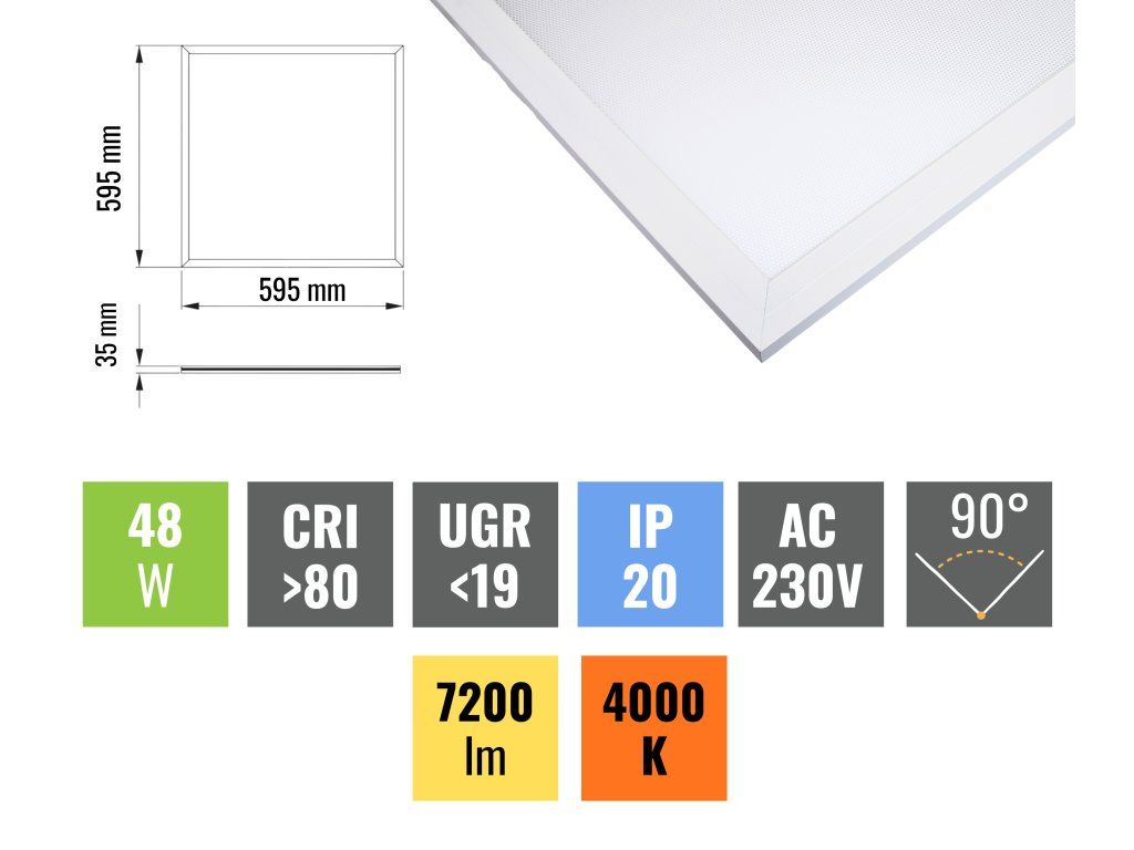 Prémiový LED panel s výkonem 48W a efektivitou 150lm/W za skvělou cenu. Model UGR disponuje unikátním mikroprismatickým krytem, který zajišťuje vynikající rozptyl světla a minimalizuje tak míru nepříjemného oslnění. Využití nalezne např. v učebnách, ordinacích nebo v projekčních studiích. Tento panel o výkonu 48W a rozměru 60 x 60cm se skvěle hodí do podhledových aplikací. Snadno se vkládá do kazetových stropů ale lze jej objednat také s příslušenstvím pro montáž do sádrokartonu nebo pro přisazení ke zděnému stropu či zavěšení.