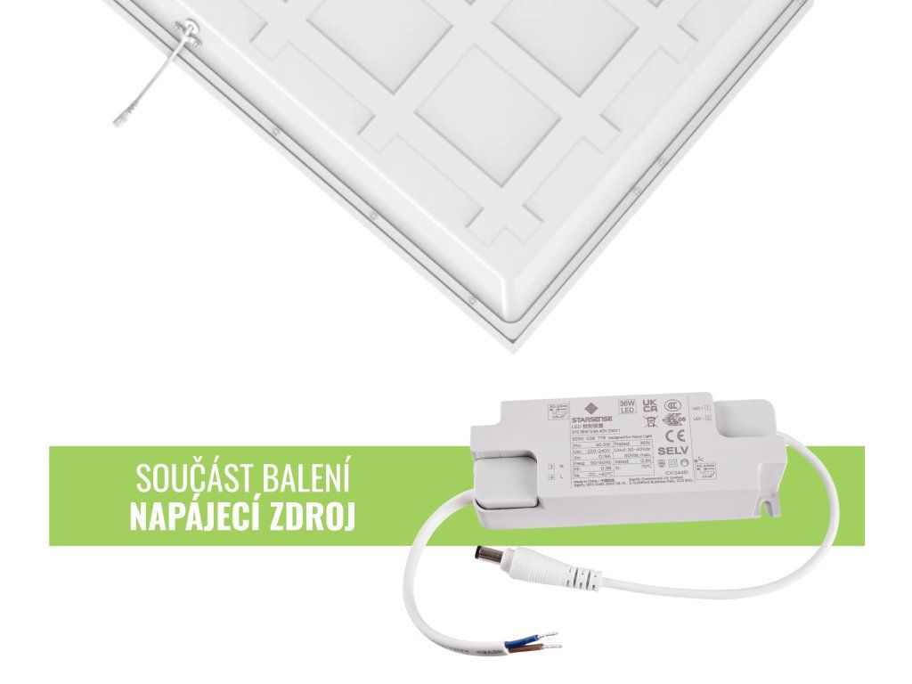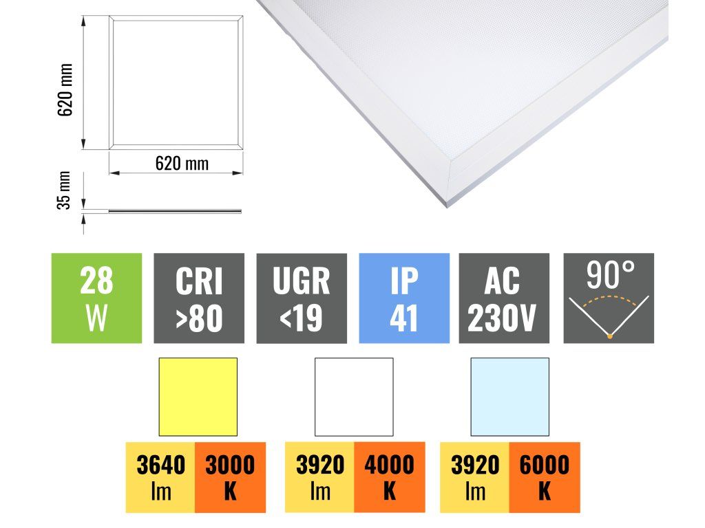 Panel je vybaven hliníkovým rámem pro efektivní odvod tepla, okamžitým startem bez blikání a životností až 50 000 hodin. Krytí IP41 jej chrání proti prachu a vlhkosti z běžného provozu, takže je vhodný pro instalaci do vnitřních prostor.