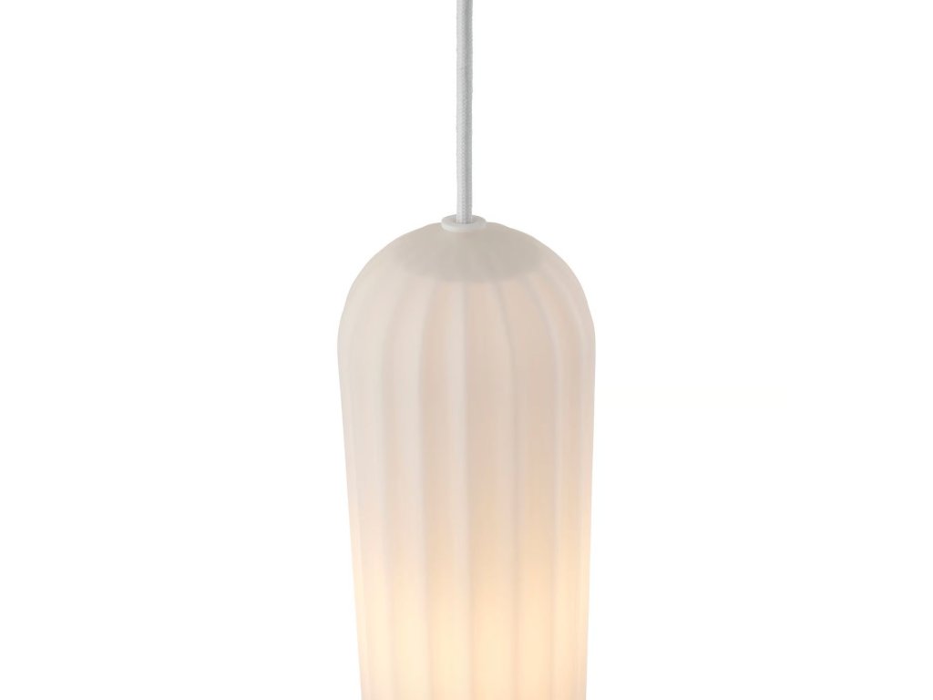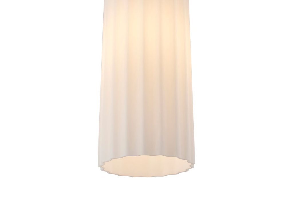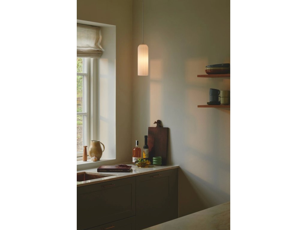 Závěsný lustr Miella v bílé barvě zaujme svým elegantním a čistým designem, který skvěle zapadne do moderních i klasicky laděných interiérů. Jeho úzké válcové stínítko z jemně rýhovaného skla působí lehce a vzdušně, přičemž vytváří příjemné měkké světlo, které přispívá k útulné atmosféře v místnosti.