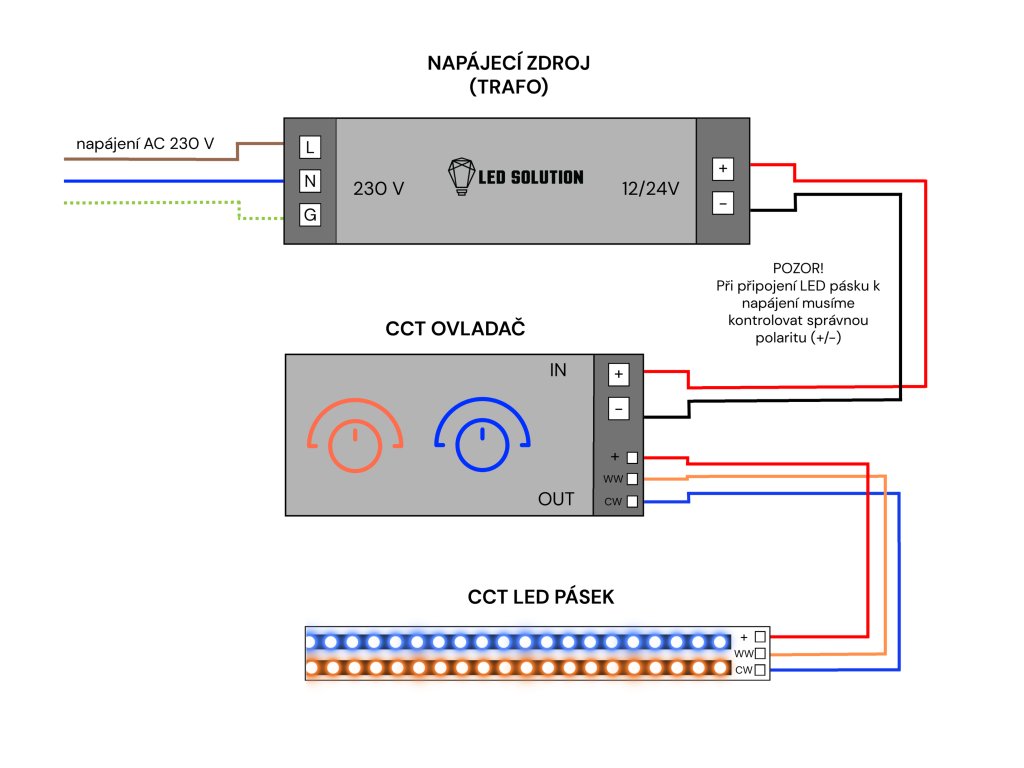 LED pásky CCT mají možnost nastavit teplotu bílé barvy. Toto nastavení lze provést pomocí ovladače, který se vsadí mezi samotný LED pásek a zdroj. V základu jsou na LED pásku vložené 2 druhy diod ve variantě teplá a studená bílá. Ovladačem můžete obě barvy nezávisle zapínat, vypínat a stmívat. Při spuštění obou barev najednou dojde ke sloučení obou barevných teplot a výchozí barva je zhruba okolo 4500K.