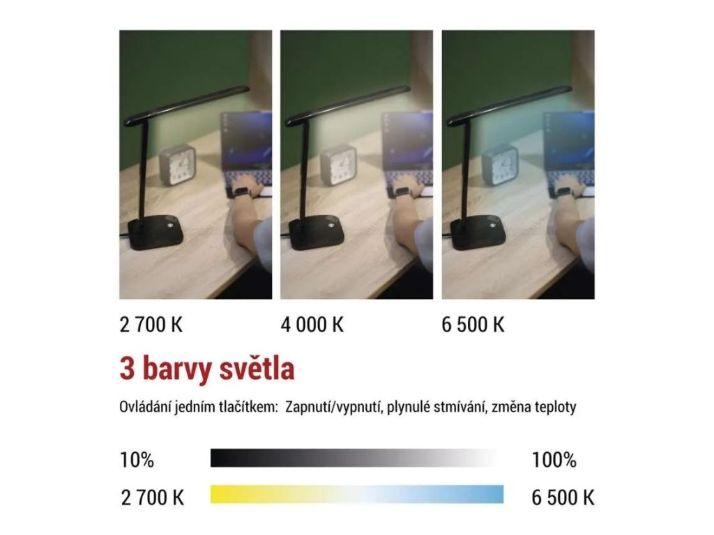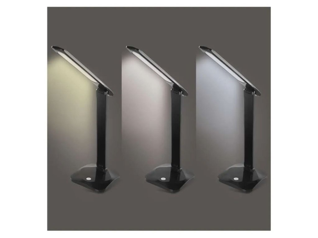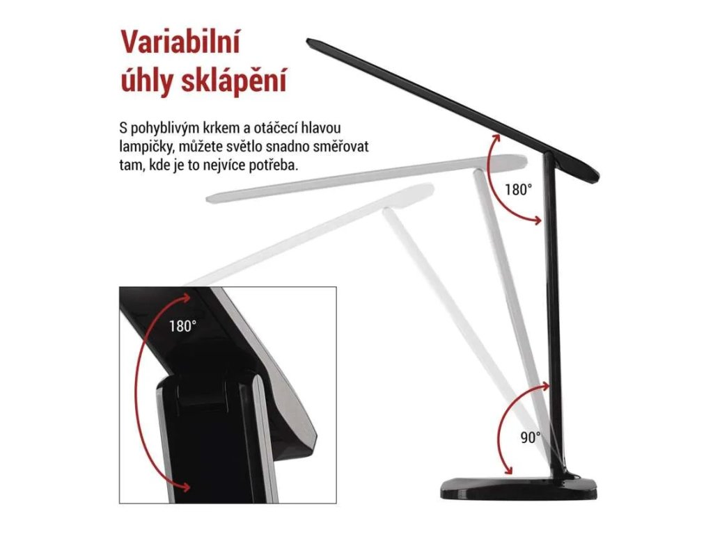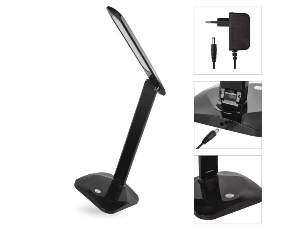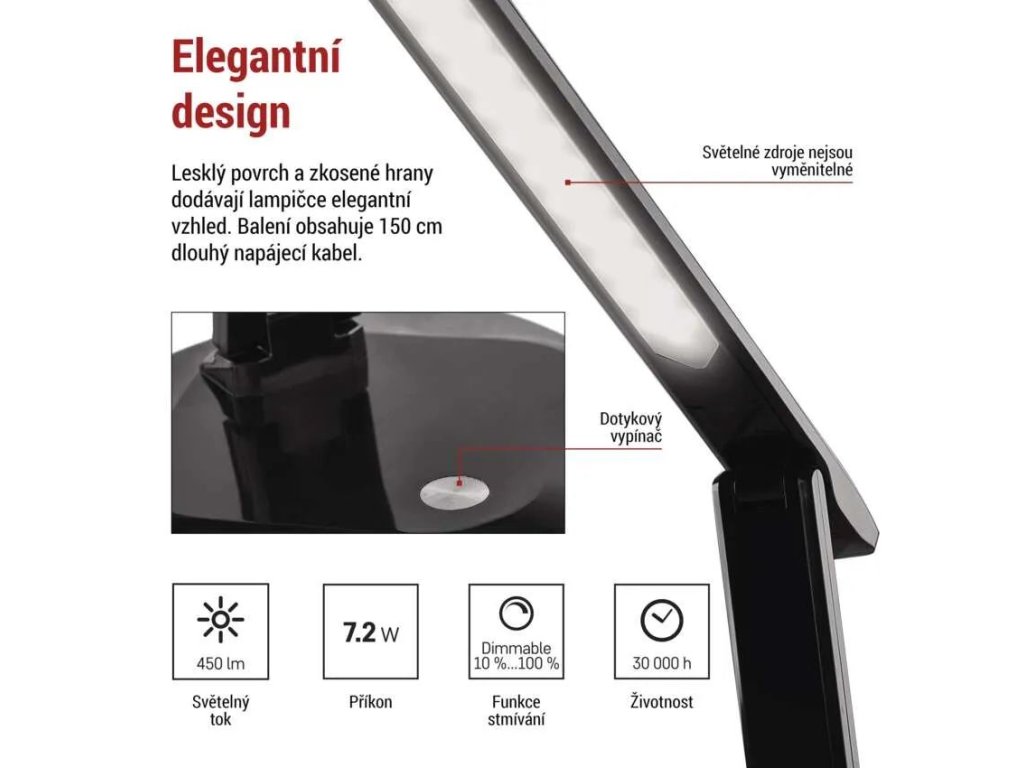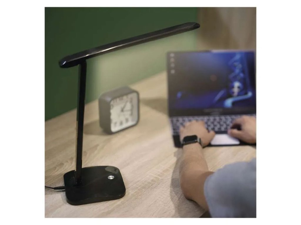 Tato černá LED stolní lampička s výkonem 7,2 W nabízí ideální kombinaci funkčnosti, jednoduchého ovládání a elegantního vzhledu, díky čemuž se stane praktickým i stylovým doplňkem každého pracovního stolu.