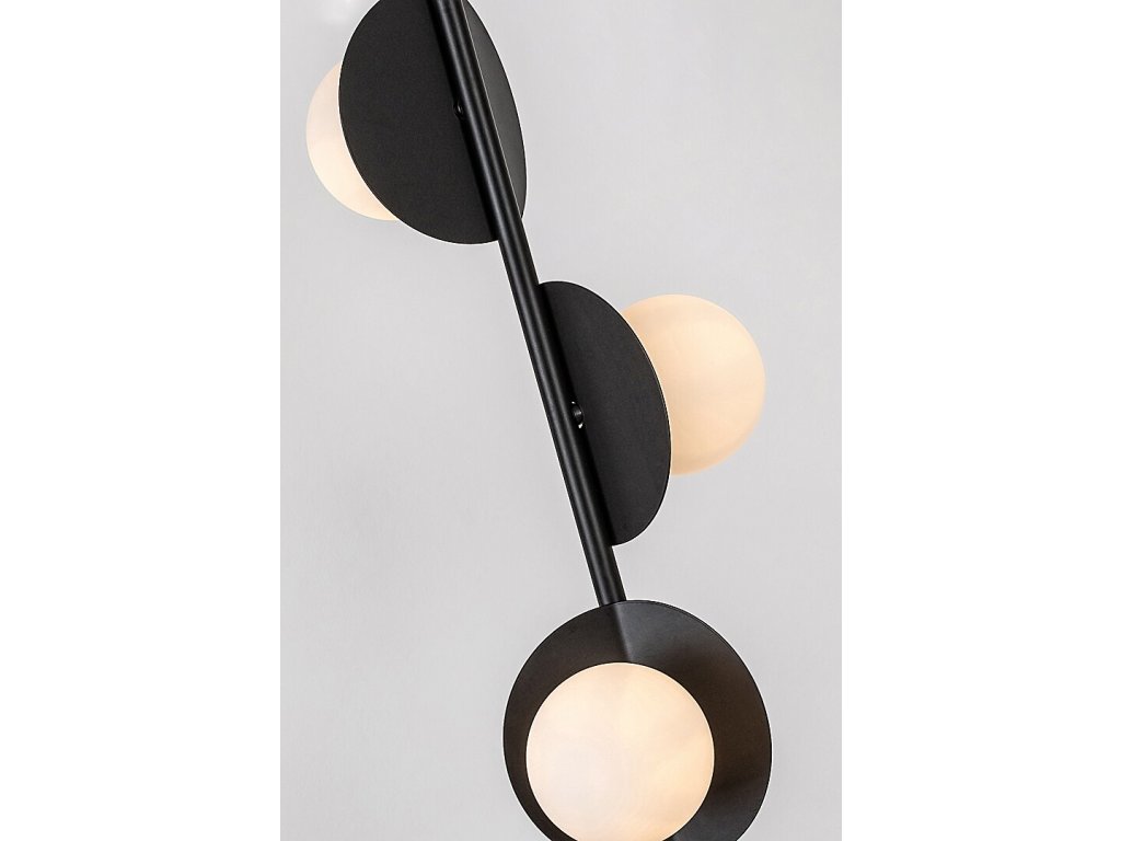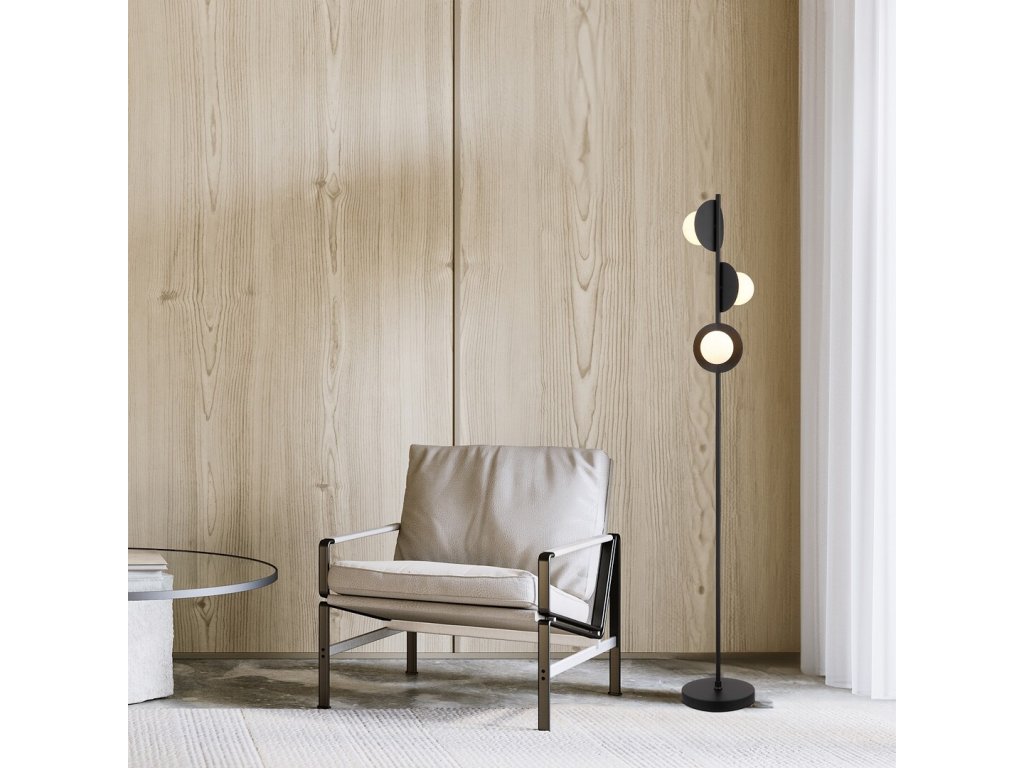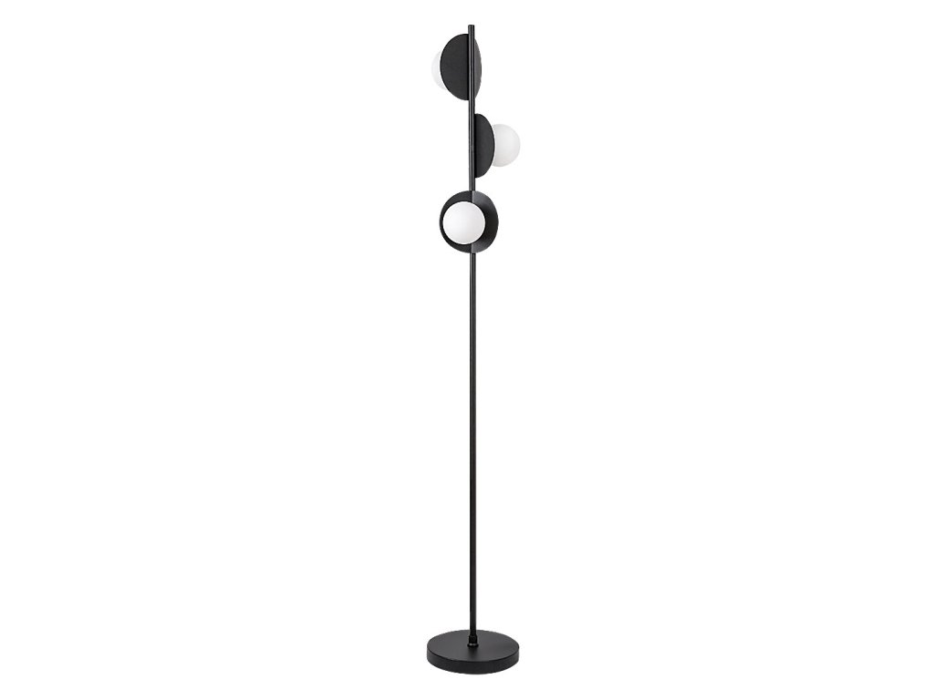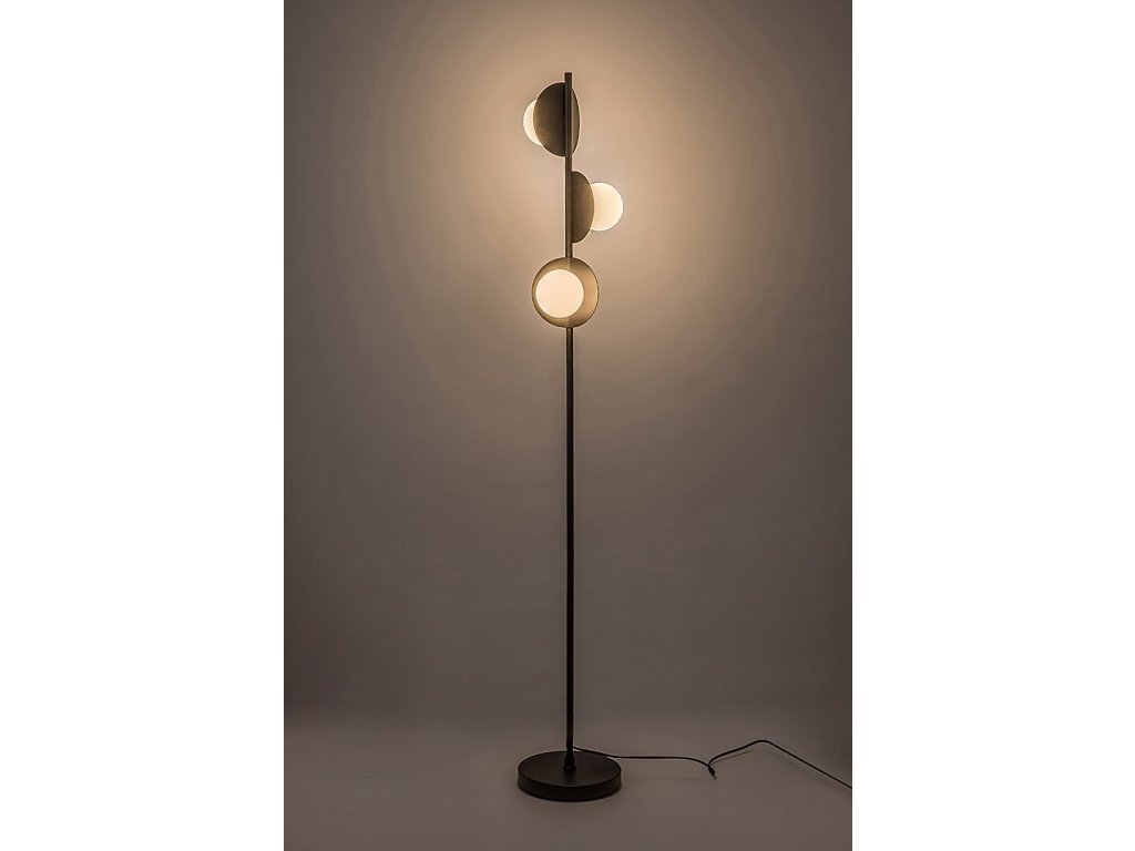 Stojací lampa Jules zaujme výrazným, kreativním designem, který kombinuje industriální styl s nadčasovou černo-bílou barevností. Štíhlá kovová konstrukce v černém provedení nese tři samostatné světelné prvky, z nichž každý je tvořen plochým kruhovým prvkem a kulovitým skleněným stínidlem. Jednotlivé hlavice jsou orientovány různými směry, díky čemuž světlo není soustředěno do jednoho bodu, ale jemně se rozprostírá po prostoru. Lampa tak působí nejen jako funkční osvětlení, ale i jako výrazný designový prvek interiéru. Skvěle se hodí do obývacího pokoje, ložnice, ale uplatní se i v jídelně nebo moderně laděné kuchyni.