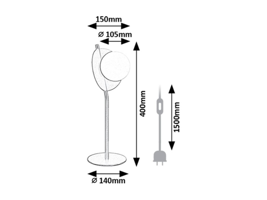Celková výška lampy činí přibližně 400 mm, průměr základny je zhruba 140 mm a průměr skleněného stínidla přibližně 105 mm. Délka přívodního kabelu je přibližně 1500 mm.