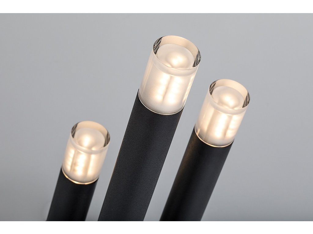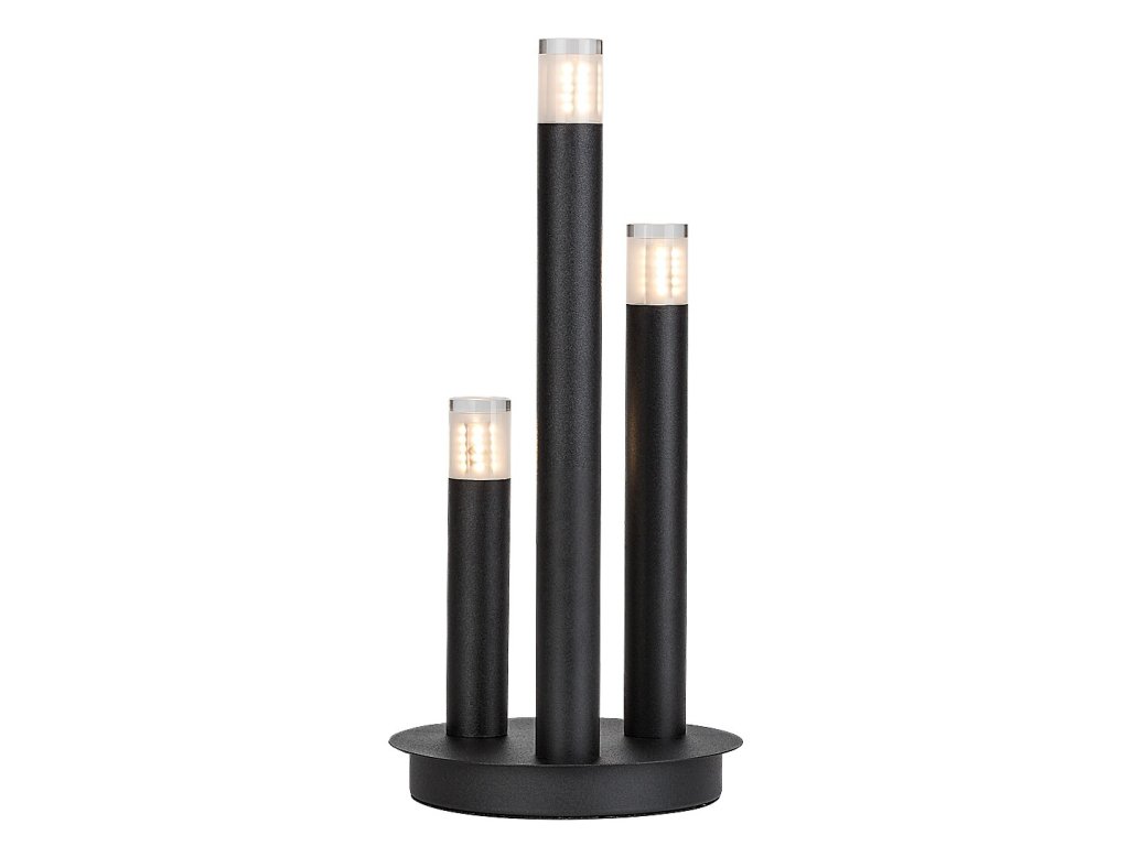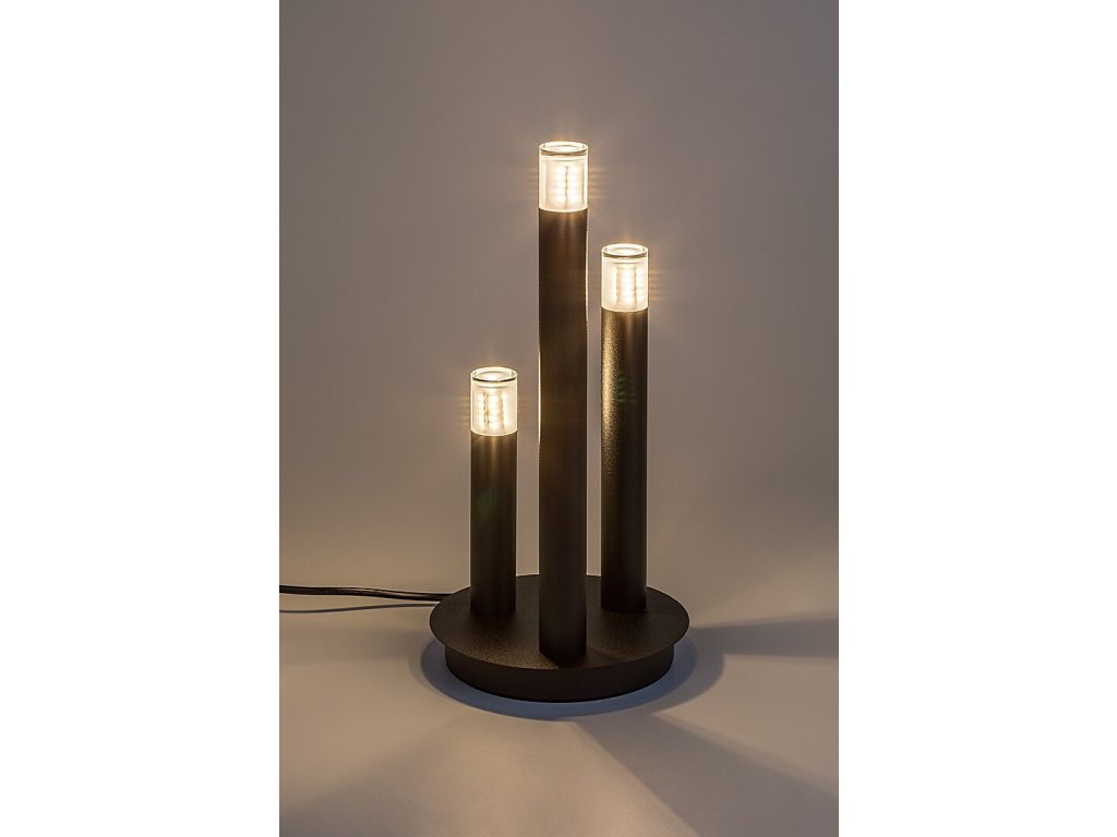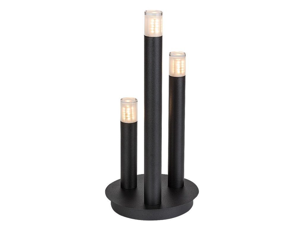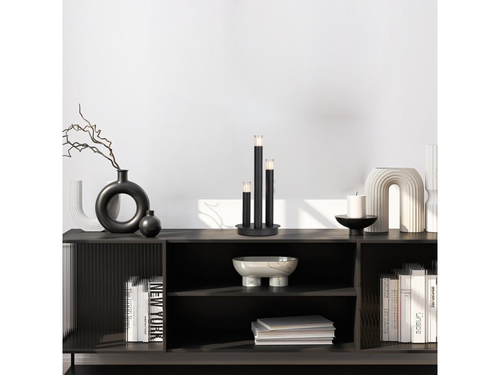 Stolní lampa Ramira zaujme originálním designem inspirovaným svíčkami, který kombinuje moderní vzhled s dekorativní funkcí. Tři štíhlé válcovité prvky různých výšek vystupují z kulaté kovové základny a společně vytvářejí elegantní světelnou kompozici. Černé kovové provedení působí nadčasově a kontrastuje s průhlednými akrylovými stínítky na horní části jednotlivých hlavic, která jemně rozptylují světlo a zvýrazňují světelný efekt. Díky svému výraznému, ale vyváženému designu se lampa hodí jako stylový doplněk do obývacího pokoje, ložnice, jídelny i moderní kuchyně.