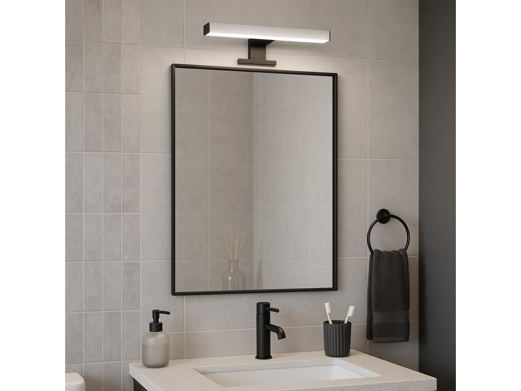 Koupelnové svítidlo nad zrcadlo Oliro představuje moderní a bezpečné řešení pro každodenní osvětlení koupelny s mimořádně variabilním způsobem uchycení. Elegantní hranatá základna v černém provedení v kombinaci s bílým stínidlem působí výrazně, moderně a nadčasově a skvěle se hodí především do minimalistických a industriálně laděných interiérů. Svítidlo nabízí tři způsoby montáže – lze jej klasicky připevnit na stěnu, pomocí praktického klipu uchytit přímo na sklo zrcadla nebo jej instalovat na nábytek, což výrazně rozšiřuje možnosti použití.