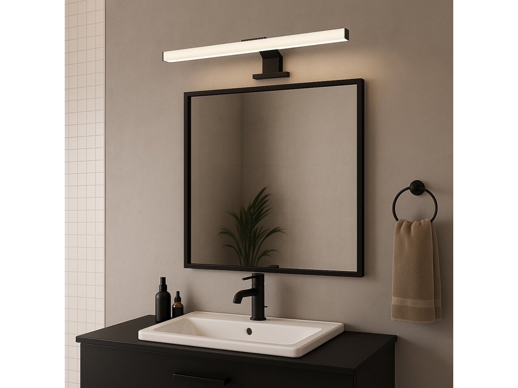 Koupelnové svítidlo nad zrcadlo Oliro představuje moderní a bezpečné řešení pro každodenní osvětlení koupelny s mimořádně variabilním způsobem uchycení. Elegantní hranatá základna v černém provedení v kombinaci s bílým stínidlem působí výrazně, moderně a nadčasově a skvěle se hodí především do minimalistických a industriálně laděných interiérů. Svítidlo nabízí tři způsoby montáže – lze jej klasicky připevnit na stěnu, pomocí praktického klipu uchytit přímo na sklo zrcadla nebo jej instalovat na nábytek, což výrazně rozšiřuje možnosti použití.