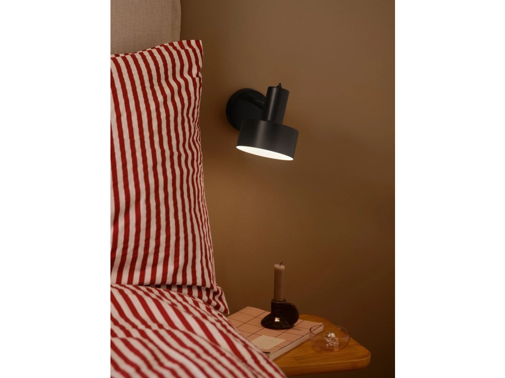 Nástěnné svítidlo Matis v černé barvě zaujme svým minimalistickým designem a praktickým provedením, které se skvěle hodí do moderních i klasických interiérů. Stínidlo má čistý tvar a decentní perforaci v horní části, která při rozsvícení vytváří jemný světelný efekt směrem ke stropu.