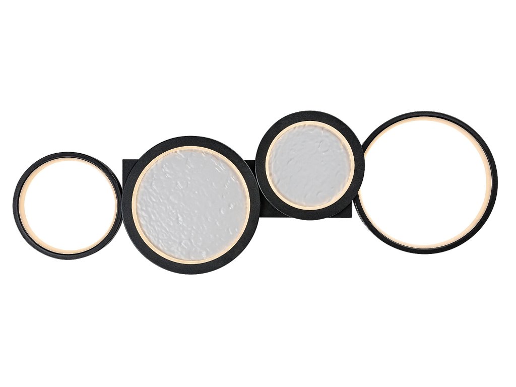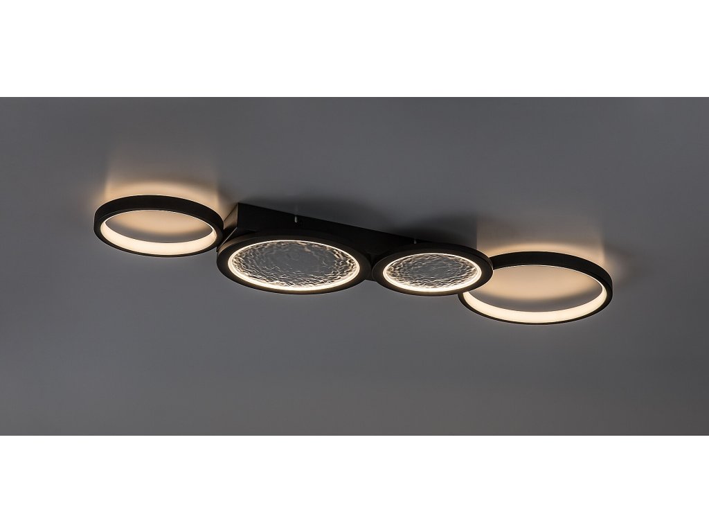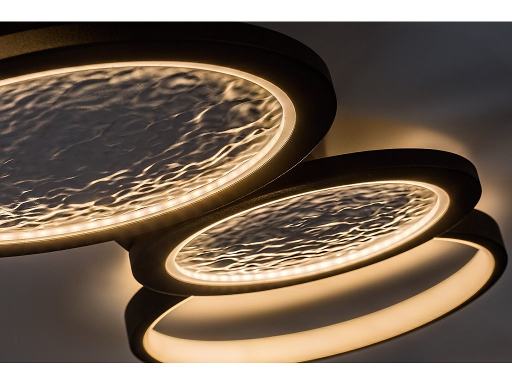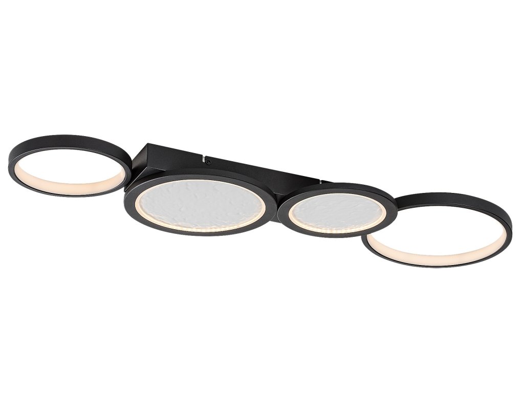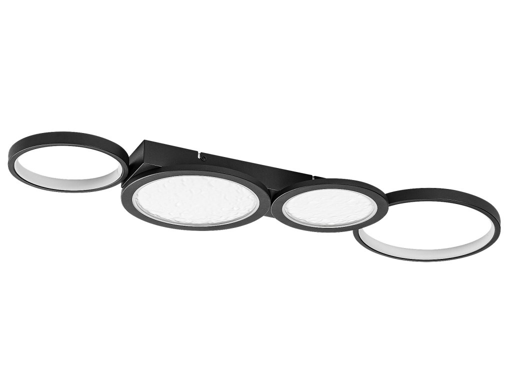 Stropní svítidlo Aranis je ideální volbou pro moderní interiéry, kde se klade důraz na výrazný design i vysokou funkčnost. Lineární uspořádání několika kruhových prvků různých velikostí vytváří dynamický a současně vyvážený vzhled, který se stane dominantním prvkem místnosti. Dva z kruhů jsou doplněny plastovým stínidlem s reliéfní strukturou inspirovanou povrchem Měsíce, která dodává světlu originální vizuální efekt. Černé kovové tělo je kombinováno s bílými světelnými plochami a celé svítidlo je uchyceno ke stropu pomocí čtvercové dekorativní základny, jež podtrhuje jeho moderní charakter.