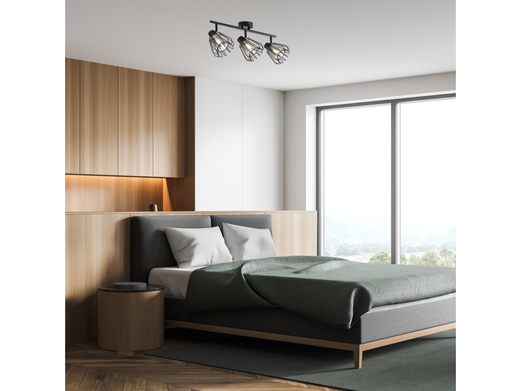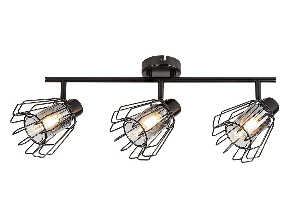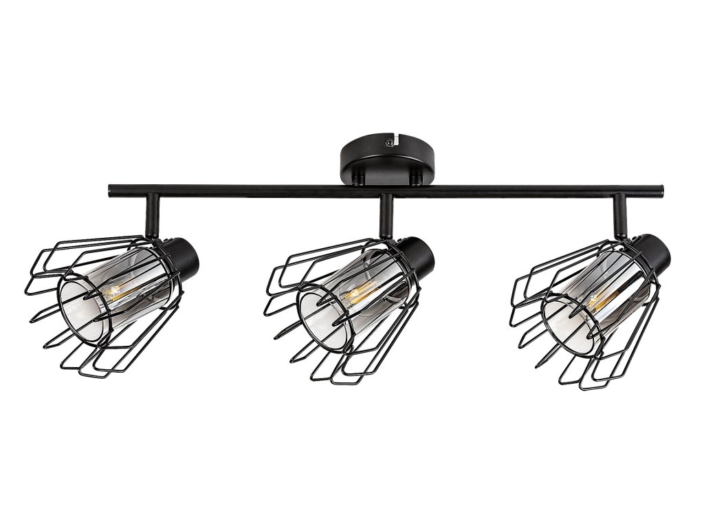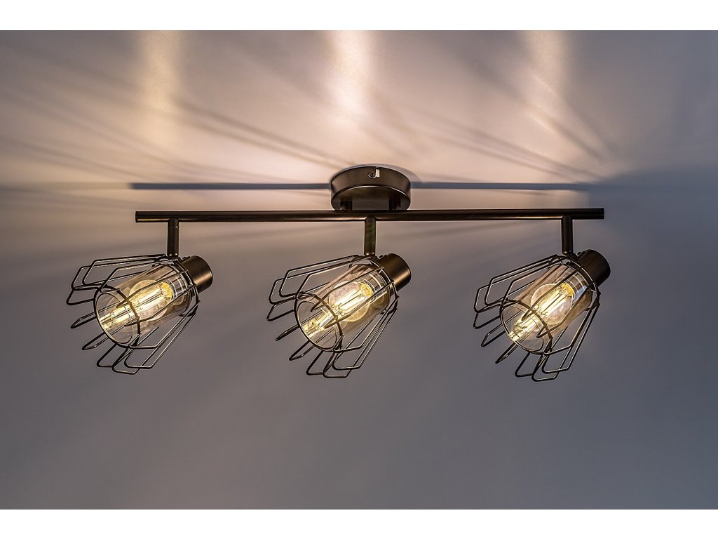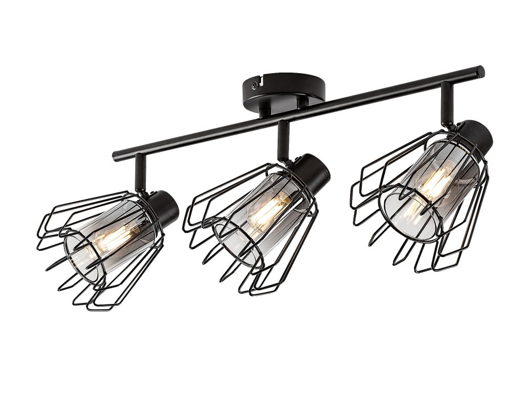 Stropní bodové svítidlo Emerencia se třemi světelnými prvky navazuje na charakteristický industriální design celé série a kombinuje technický vzhled s dekorativním detailem. Černá kovová konstrukce je doplněna otevřenými drátěnými stínidly ve tvaru písmene A, uvnitř nichž se nachází válcová kouřová skleněná stínidla. Tato kombinace dodává svítidlu surový industriální výraz a zároveň změkčuje světlo pro příjemné osvětlení prostoru.