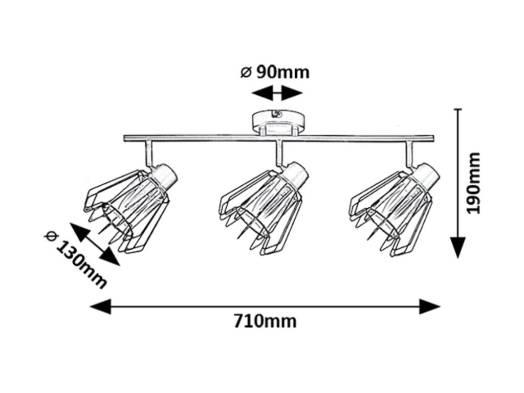 Celková šířka svítidla činí přibližně 710 mm, výška od stropu je 190 mm, průměr stropní základny je 90 mm a průměr jednotlivých světelných hlav přibližně 130 mm.