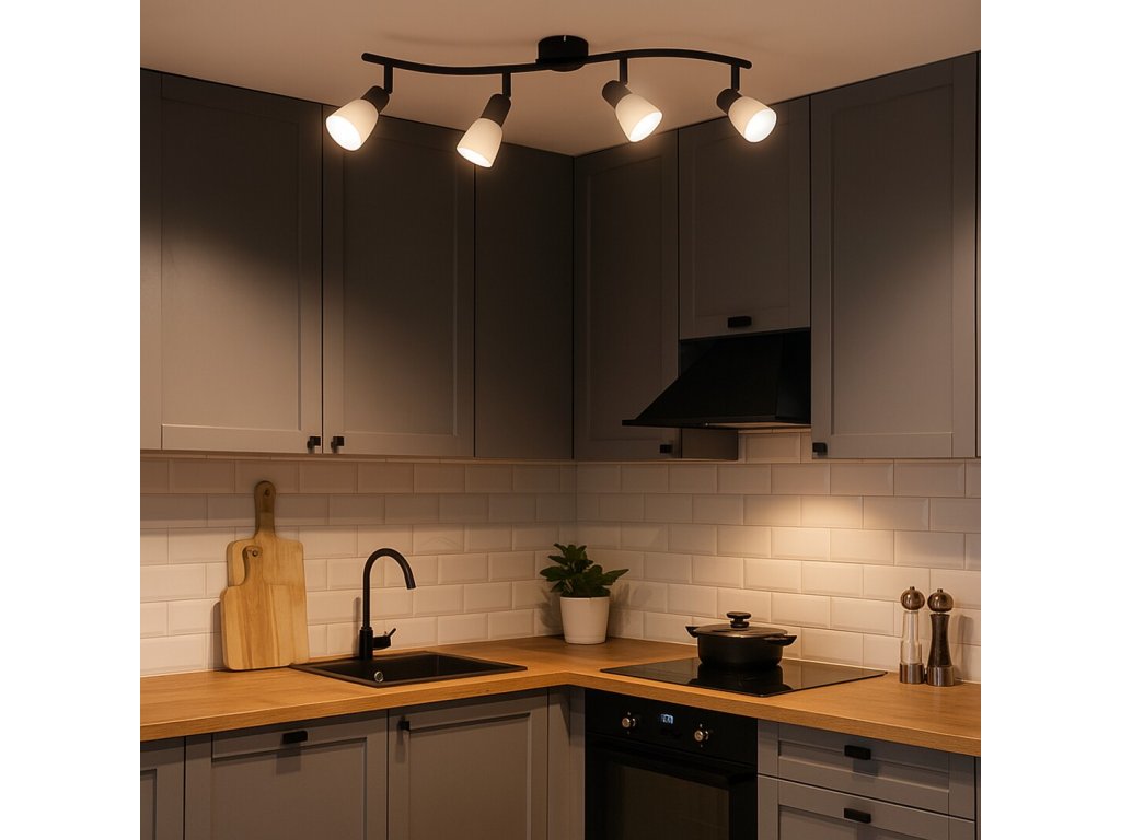 Hlavice svítidel jsou uchyceny na lehce prohnuté nosné liště, která je připevněna ke stropu pomocí kulaté dekorační základny. Díky kloubovému uchycení lze každou hlavici samostatně natáčet a směrovat, což umožňuje cílené nasvícení konkrétních částí místnosti. Svítidlo je vhodné do obývacího pokoje, jídelny, chodby i ložnice, kde může sloužit jako hlavní nebo doplňkové osvětlení.