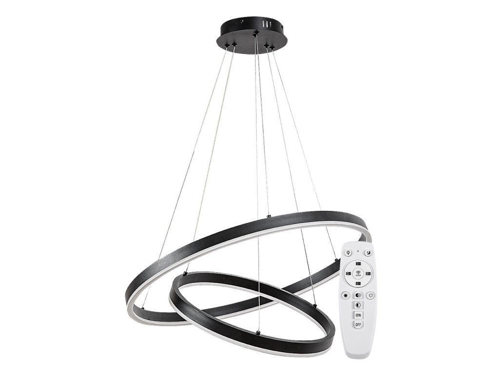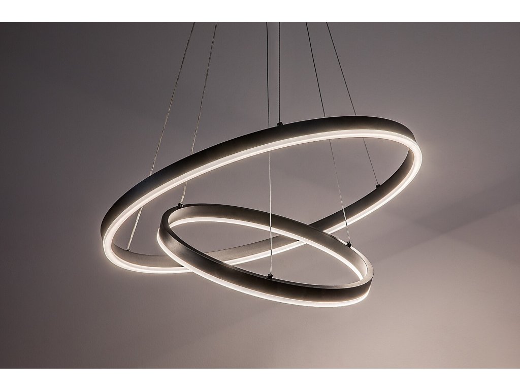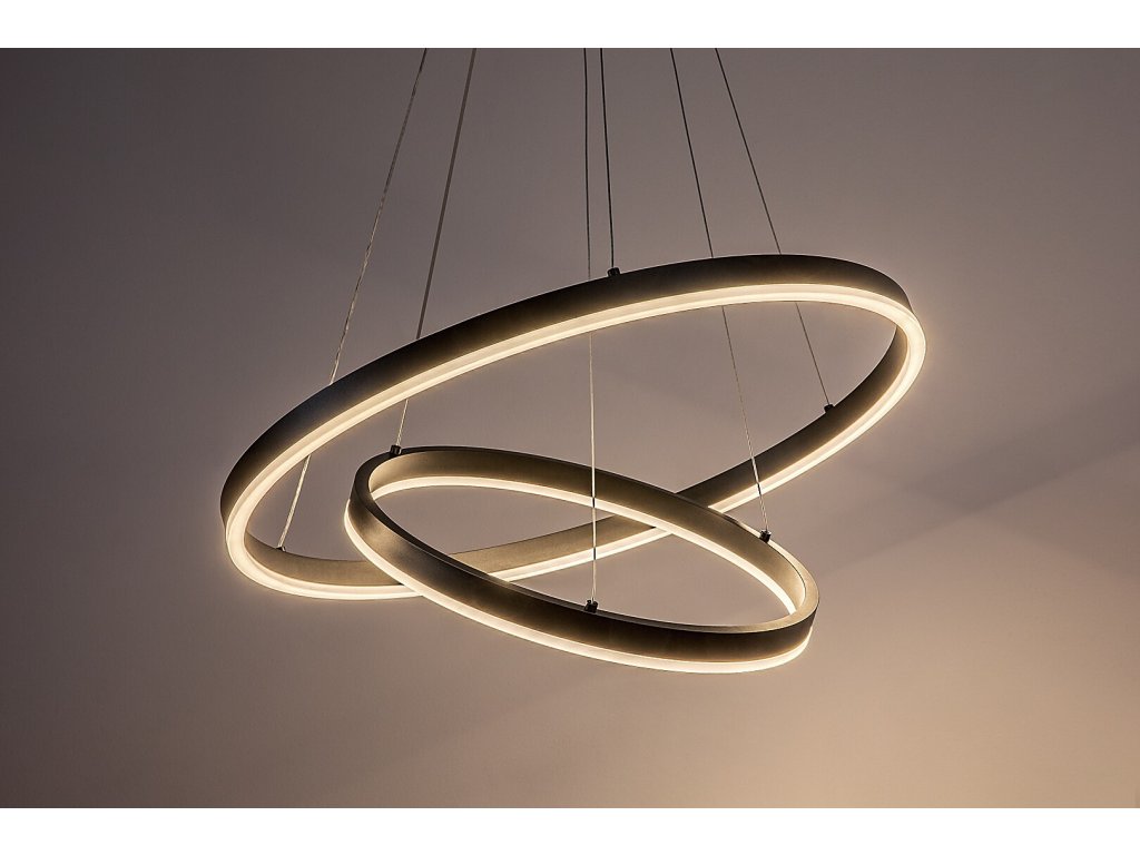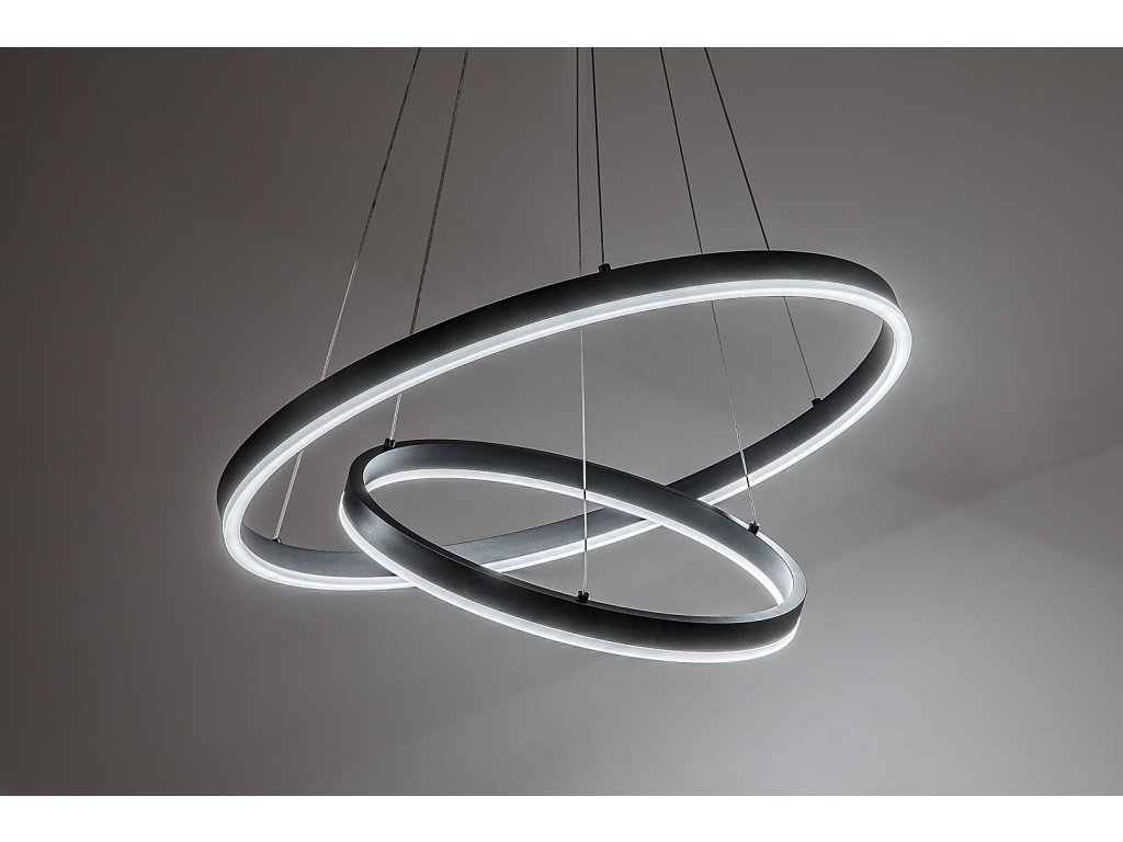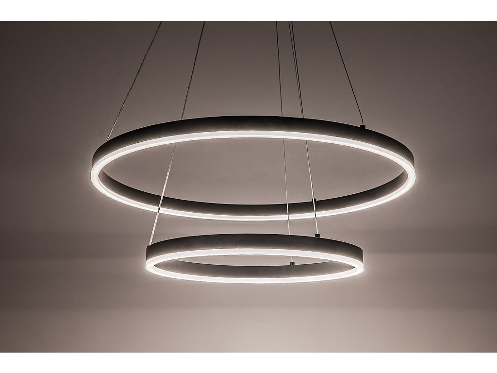 Celkový průměr většího kruhu činí 600 mm, menší kruh má průměr 400 mm. Průměr stropní základny je 180 mm a maximální výška zavěšení dosahuje 1 200 mm, přičemž délku závěsů lze při instalaci individuálně upravit podle potřeb prostoru.