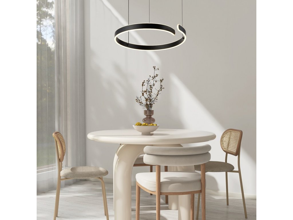 Závěsné LED svítidlo Silnora zaujme čistým moderním designem, který staví na jednoduchých liniích a originálním, mírně otevřeném kruhovém tvaru. Černé kovové provedení působí elegantně a nadčasově, zatímco bílé silikonové stínidlo po vnitřním obvodu zajišťuje rovnoměrné a příjemné rozptýlení světla bez oslnění. Minimalistické zpracování dává svítidlu lehký a vzdušný vzhled, díky kterému se přirozeně začlení do současných interiérů a zároveň v nich vytvoří výrazný vizuální prvek.