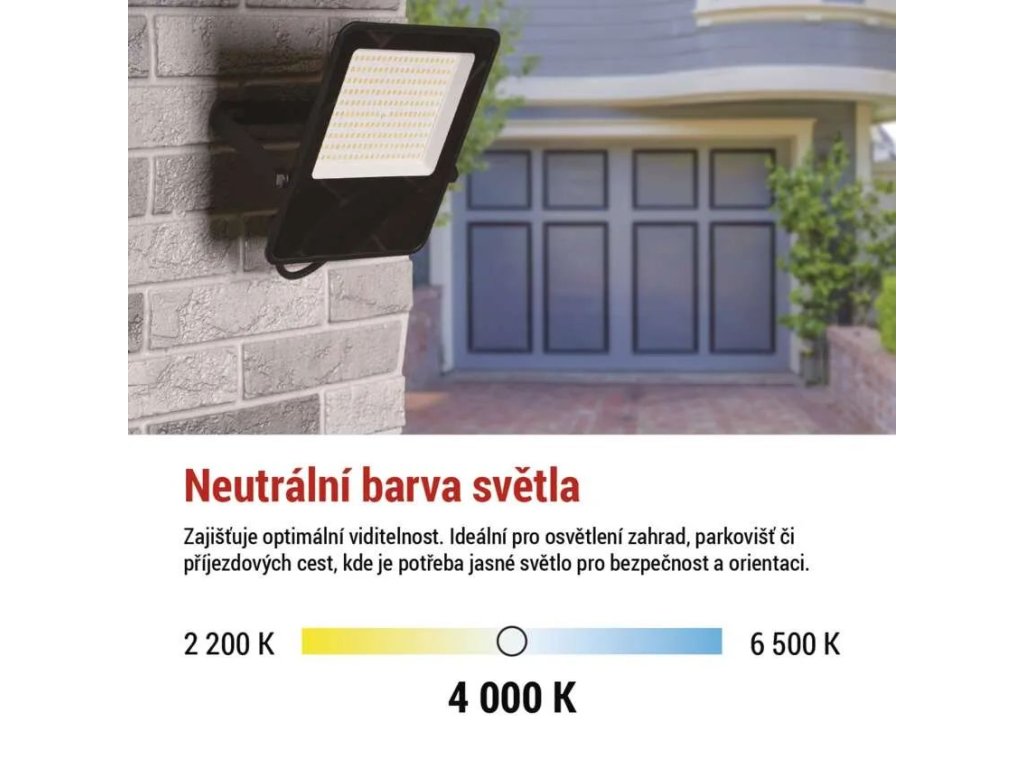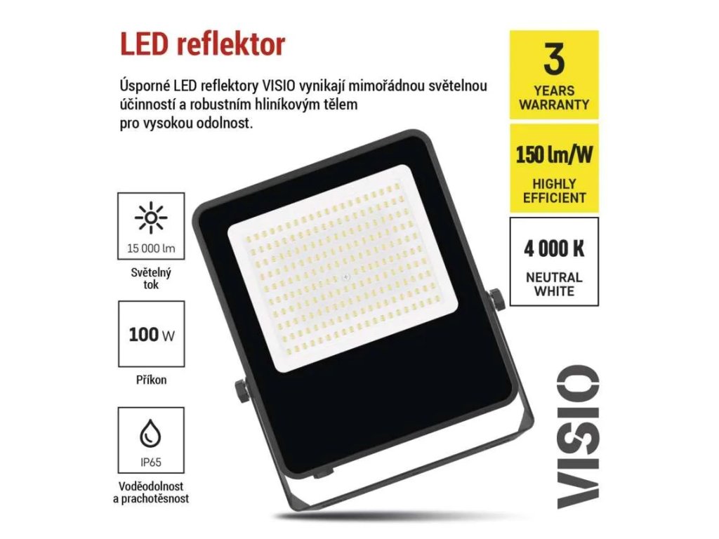 LED reflektor s výkonem 100W představuje moderní, spolehlivé a energeticky úsporné řešení pro osvětlení venkovních i vnitřních prostor. Se světelným tokem 15 000 lumenů nabízí dostatek světla pro nasvícení dvora, garáže, příjezdové cesty nebo skladových prostor. Díky pokročilé LED technologii s vysokou účinností 150 lm/W svítí intenzivně, ale zároveň šetří náklady na elektřinu.