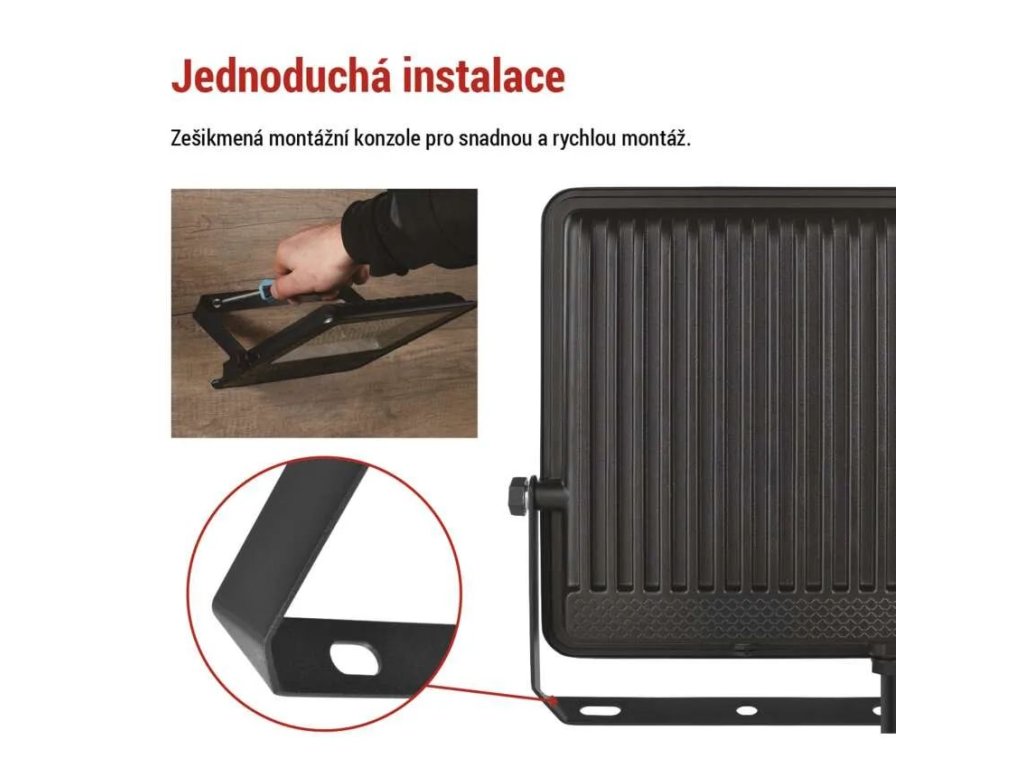 Reflektor je ihned po zapnutí na plném výkonu, bez nepříjemného blikání. Hodí se nejen pro stálé osvětlení, ale i jako bezpečnostní světlo, které lze zapojit do systému s pohybovým čidlem. Jeho kompaktní rozměry a zešikmená montážní konzole umožňují snadnou instalaci a flexibilní nastavení úhlu svícení podle potřeby. Ocelová montážní konzole je připravená pro rychlé uchycení – stačí nasadit a připojit do sítě.