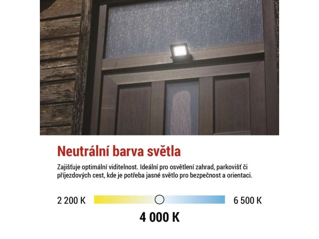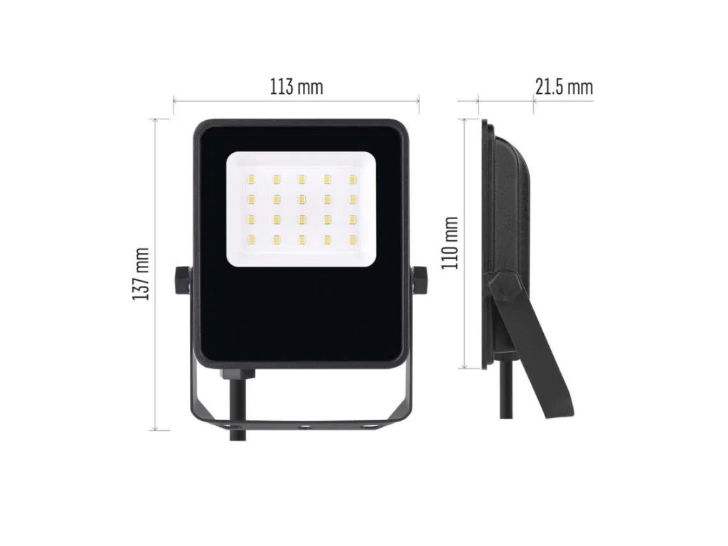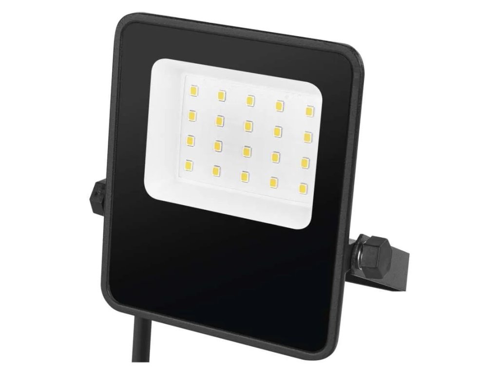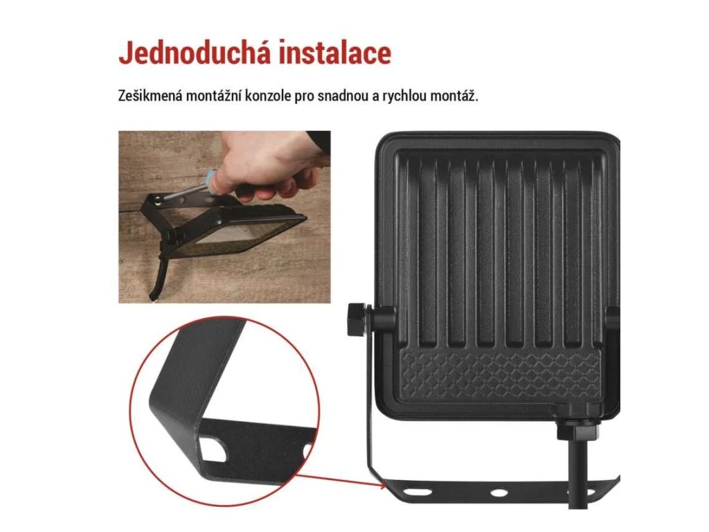 Reflektor je ihned po zapnutí na plném výkonu, bez nepříjemného blikání. Hodí se nejen pro stálé osvětlení, ale i jako bezpečnostní světlo, které lze zapojit do systému s pohybovým čidlem. Jeho kompaktní rozměry a zešikmená montážní konzole umožňují snadnou instalaci a flexibilní nastavení úhlu svícení podle potřeby. Ocelová montážní konzole je připravená pro rychlé uchycení – stačí nasadit a připojit do sítě.