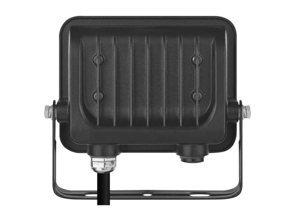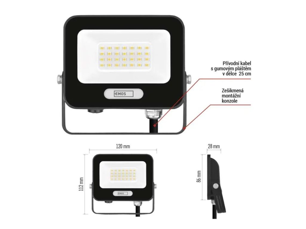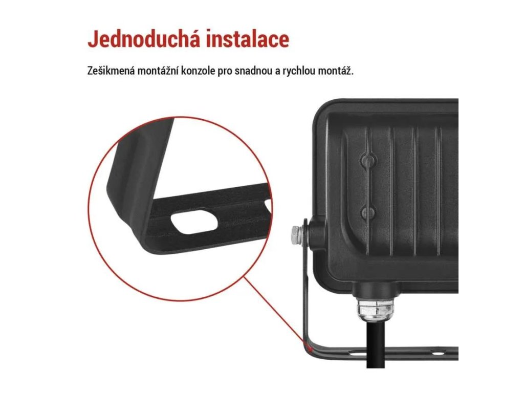 Součástí konstrukce je praktická zešikmená montážní konzole, díky níž lze snadno nastavit přesný směr svícení a upevnit reflektor na fasádu, stěnu nebo jiný povrch bez složitých úprav. K rychlému zapojení slouží přívodní kabel s gumovým pláštěm o délce 25 cm, který zajišťuje bezpečné a spolehlivé připojení. Reflektor se po zapnutí okamžitě rozsvítí na plný výkon, pracuje bez blikání a díky moderní LED technologii výrazně snižuje provozní náklady.
