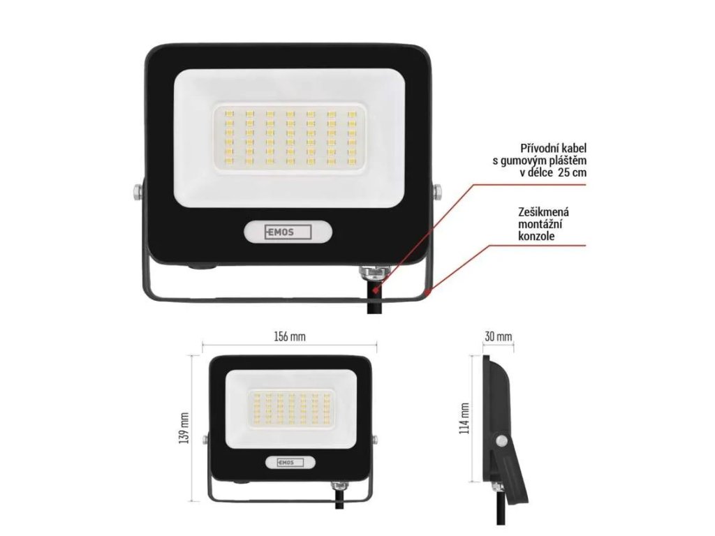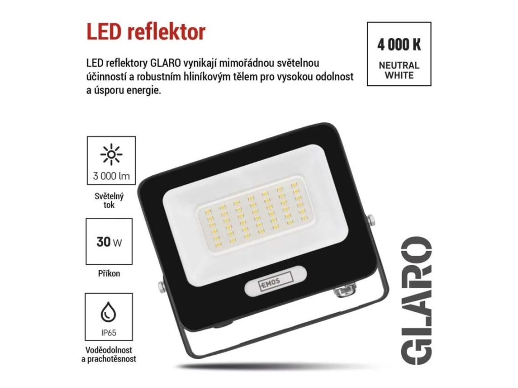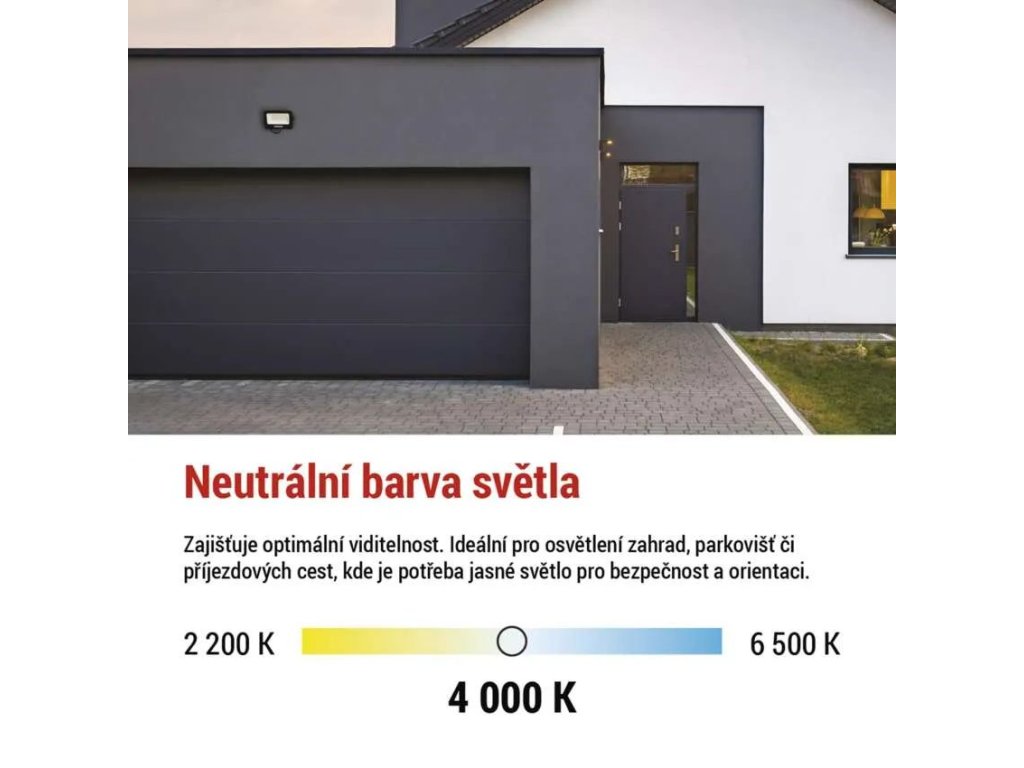 LED reflektor s výkonem 30 W přináší vysokou světelnou účinnost 100 lm/W a poskytuje tak silné a zároveň úsporné osvětlení pro venkovní i vnitřní použití. Světelný tok 3 000 lm spolehlivě nasvítí fasády domů, příjezdové cesty, zahrady, garáže i menší firemní prostory. Neutrální bílá barva světla s teplotou 4 000 K zajišťuje přirozenou viditelnost a rovnoměrné osvětlení bez nepříjemných barevných tónů, takže je vhodná pro orientaci, bezpečný pohyb i práci.