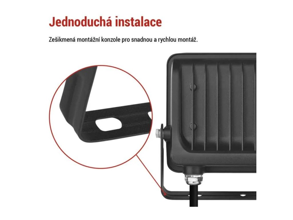 Součástí konstrukce je praktická zešikmená montážní konzole, díky níž lze snadno nastavit přesný směr svícení a upevnit reflektor na fasádu, stěnu nebo jiný povrch bez složitých úprav. K rychlému zapojení slouží přívodní kabel s gumovým pláštěm o délce 25 cm, který zajišťuje bezpečné a spolehlivé připojení. Reflektor se po zapnutí okamžitě rozsvítí na plný výkon, pracuje bez blikání a díky moderní LED technologii výrazně snižuje provozní náklady.