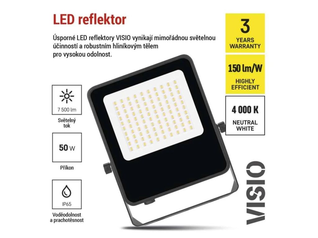 LED reflektor s výkonem 50W představuje moderní, spolehlivé a energeticky úsporné řešení pro osvětlení venkovních i vnitřních prostor. Se světelným tokem 7 500 lumenů nabízí dostatek světla pro nasvícení dvora, garáže, příjezdové cesty nebo skladových prostor. Díky pokročilé LED technologii s vysokou účinností 150 lm/W svítí intenzivně, ale zároveň šetří náklady na elektřinu.