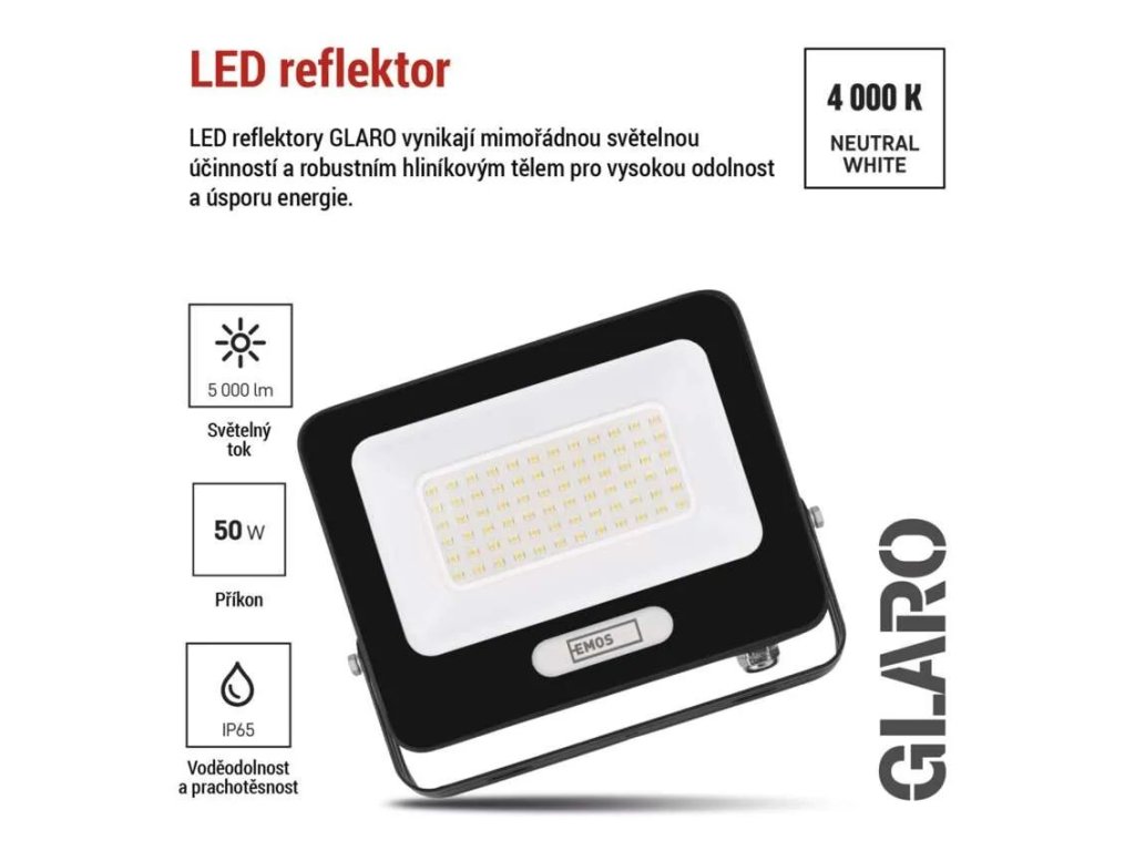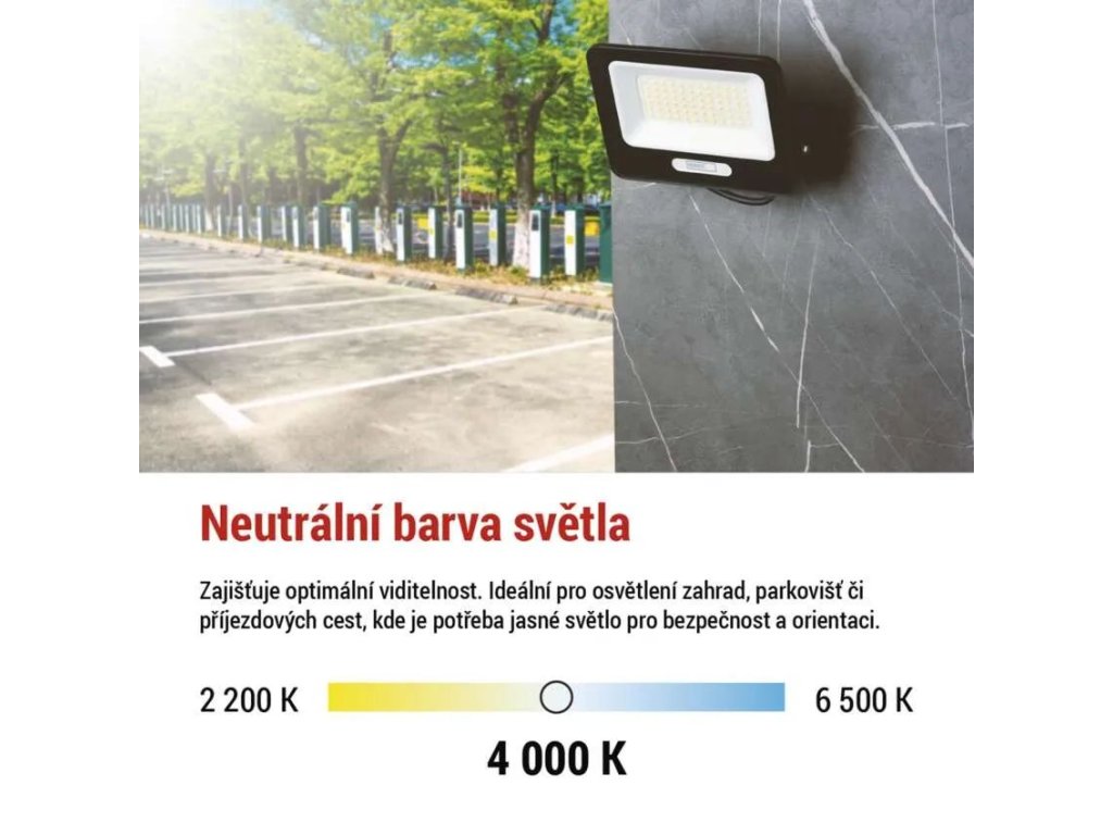 LED reflektor s výkonem 50 W přináší vysokou světelnou účinnost 100 lm/W a poskytuje tak silné a zároveň úsporné osvětlení pro venkovní i vnitřní použití. Světelný tok 5 000 lm spolehlivě nasvítí fasády domů, příjezdové cesty, zahrady, garáže i menší firemní prostory. Neutrální bílá barva světla s teplotou 4 000 K zajišťuje přirozenou viditelnost a rovnoměrné osvětlení bez nepříjemných barevných tónů, takže je vhodná pro orientaci, bezpečný pohyb i práci.