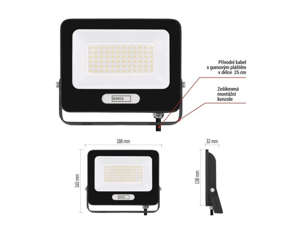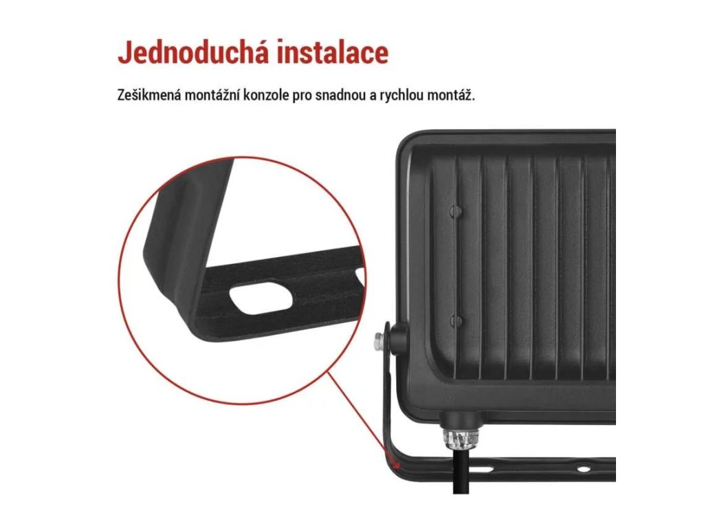 Součástí konstrukce je praktická zešikmená montážní konzole, díky níž lze snadno nastavit přesný směr svícení a upevnit reflektor na fasádu, stěnu nebo jiný povrch bez složitých úprav. K rychlému zapojení slouží přívodní kabel s gumovým pláštěm o délce 25 cm, který zajišťuje bezpečné a spolehlivé připojení. Reflektor se po zapnutí okamžitě rozsvítí na plný výkon, pracuje bez blikání a díky moderní LED technologii výrazně snižuje provozní náklady.