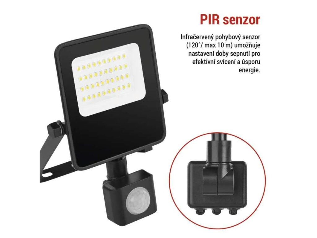 Reflektor je vybaven infračerveným pohybovým senzorem, který automaticky rozsvítí světlo při detekci pohybu a po určité době jej opět vypne. Úhel záběru senzoru dosahuje 120° a reaguje na pohyb až do vzdálenosti 10 metrů, což zajišťuje spolehlivé pokrytí širokého prostoru. Doba svícení je nastavitelná, díky čemuž lze přizpůsobit provoz reflektoru konkrétním potřebám a zbytečně neplýtvat energií.