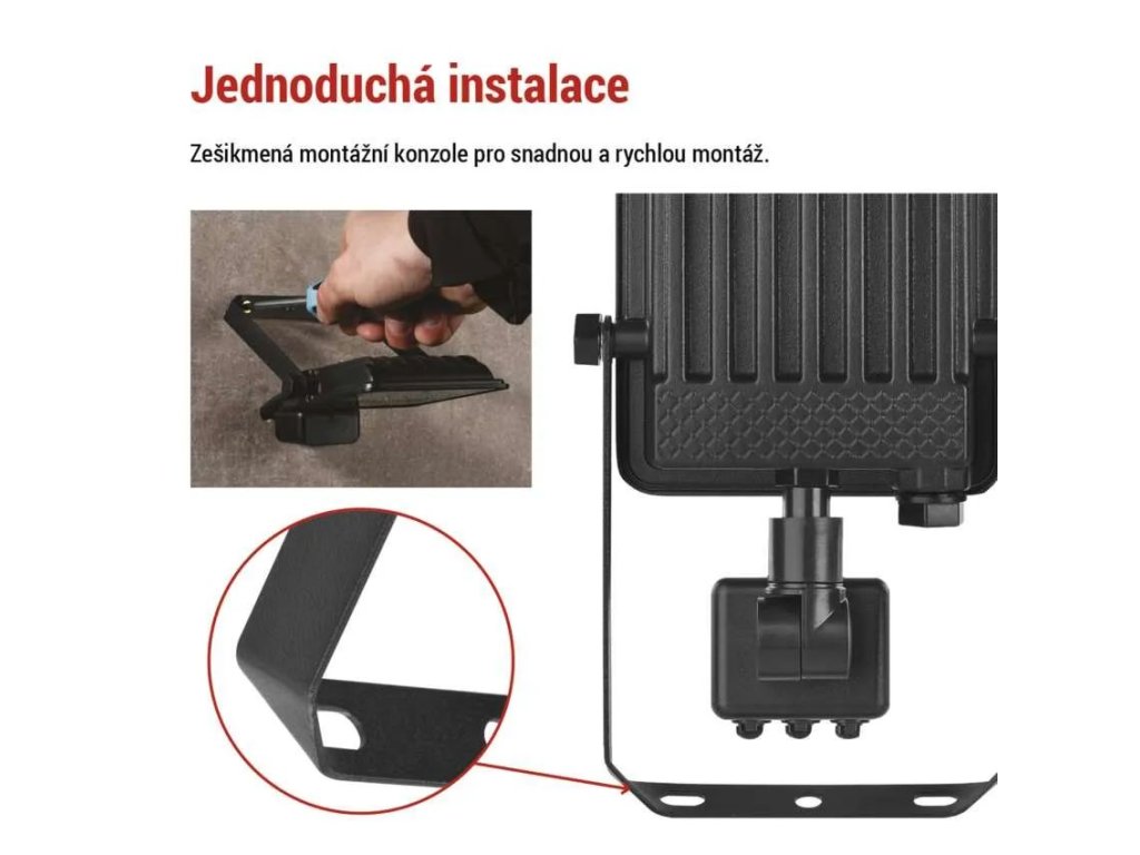 Reflektor je ihned po zapnutí na plném výkonu, bez nepříjemného blikání. Hodí se nejen pro stálé osvětlení, ale i jako bezpečnostní světlo, které lze zapojit do systému s pohybovým čidlem. Jeho kompaktní rozměry a zešikmená montážní konzole umožňují snadnou instalaci a flexibilní nastavení úhlu svícení podle potřeby. Ocelová montážní konzole je připravená pro rychlé uchycení – stačí nasadit a připojit do sítě.