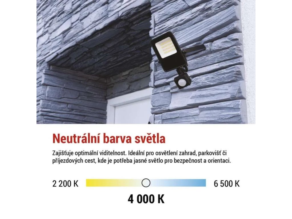 LED reflektor s výkonem 20W a integrovaným pohybovým senzorem představuje moderní, spolehlivé a energeticky úsporné řešení pro automatické osvětlení venkovních i vnitřních prostor. Se světelným tokem 3 000 lumenů nabízí dostatek světla pro nasvícení vchodů, garáží, příjezdových cest, zahrad nebo firemních prostor. Díky pokročilé LED technologii s vysokou účinností 150 lm/W svítí intenzivně, ale zároveň šetří náklady na elektřinu.