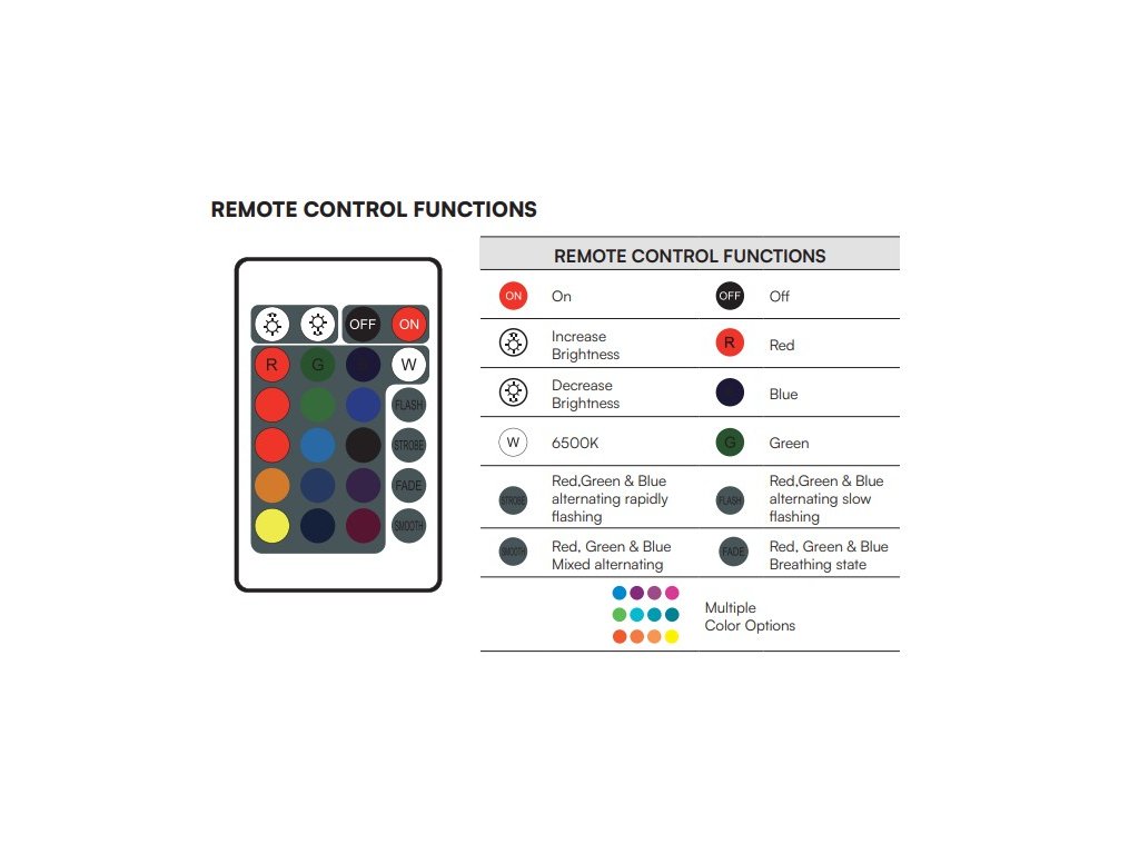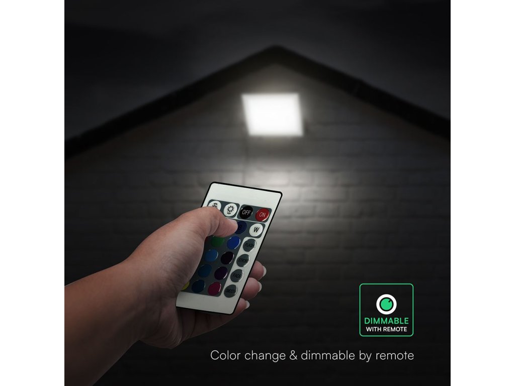 Ovládání reflektoru probíhá pomocí přiloženého dálkového ovladače, kterým lze světlo zapínat a vypínat, plynule měnit barvy, regulovat jas i volit dynamické světelné režimy. Přepínání mezi barevným RGB režimem a studenou bílou je okamžité a bez zpoždění, což výrazně zvyšuje komfort používání. Kvalitní SMD LED čipy ve spojení s integrovaným konstantním proudovým IC driverem zajišťují stabilní světelný výkon bez blikání a bez nutnosti externího napájecího zdroje.