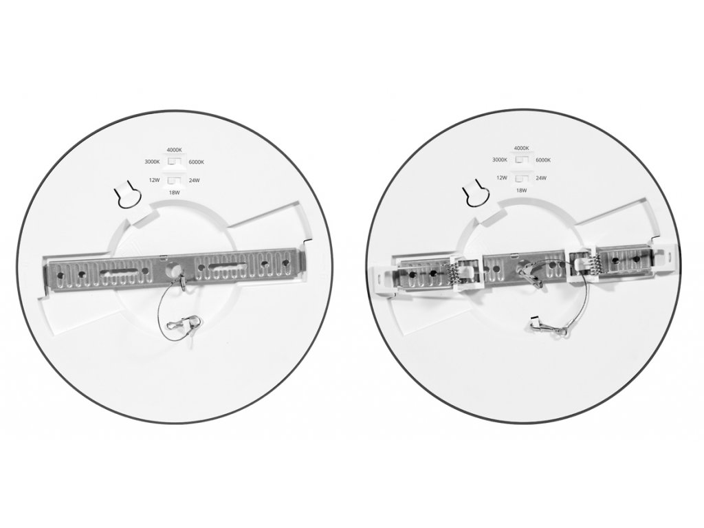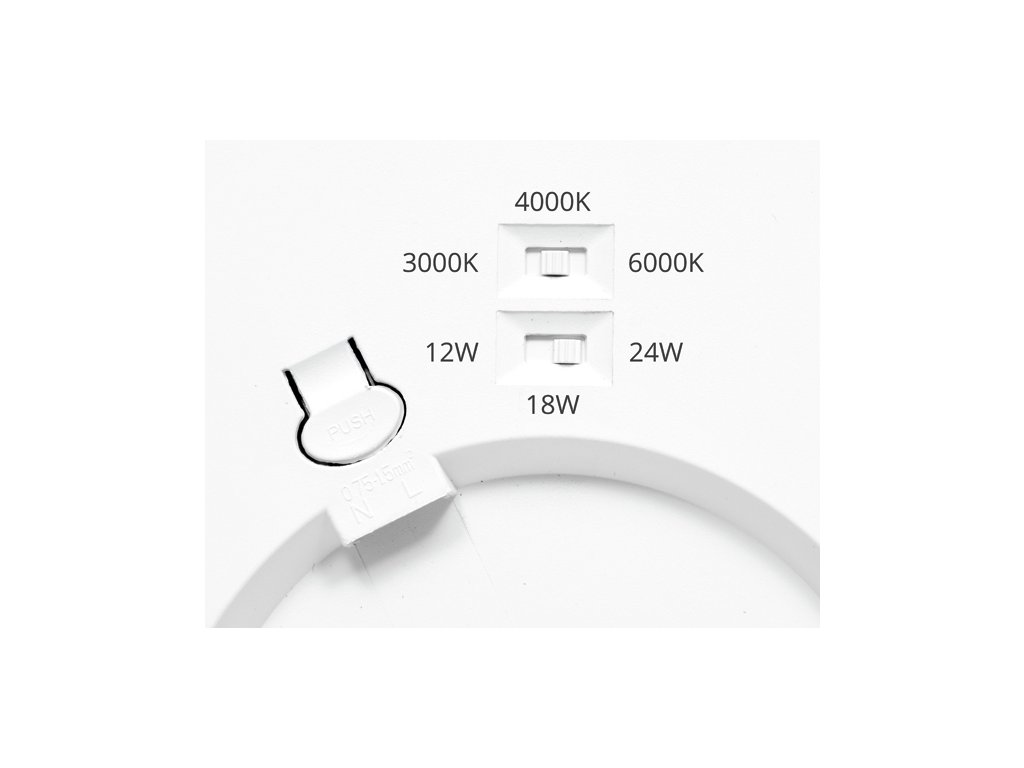 Tento CCT model nabízí DIP přepínač nastavení výkonu a teploty chromatičnosti. Díky tomu můžete nastavit požadovaný výkon 6-12-18W a libovolně nastavit teplou bílou 3000K, denní bílou 4000K nebo studenou bílou 6000K.